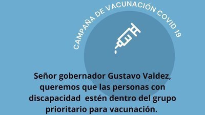 Necesitamos priorizar la vacunacion de las personas con discapacidad. La mortalidad para ellos es del 7%,mucho mayor que para el resto de la poblacion en la cual es el 2%. Necesitan volver a sus terapias de forma segura para no perder años de esfuerzo.Muchos de ellos dependen de otra persona. No son concientes del peligro de este virus, no saben expresar si se les cierra la garganta, si les duele el cuerpo. Por favor ayudenos en este pedido. Son muy vulnerables y no tienen voz. Ya algunas provincias tomaron conciencia de esto como Cordoba y Chaco. Acompañen esta lucha y que asi pueda llegar el pedido a quien deba tomar la desicion
