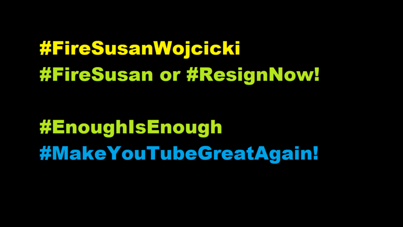 It's time for Susan Wojcicki to be replaced as YouTube CEO! #FireSusan #FireSusanWojcicki #ResignNow #SusanWojcicki #EndOppression #EndCensorship #EndRacism #EndCorruptionNow #EnoughIsEnough #MakeYouTubeGreatAgain!