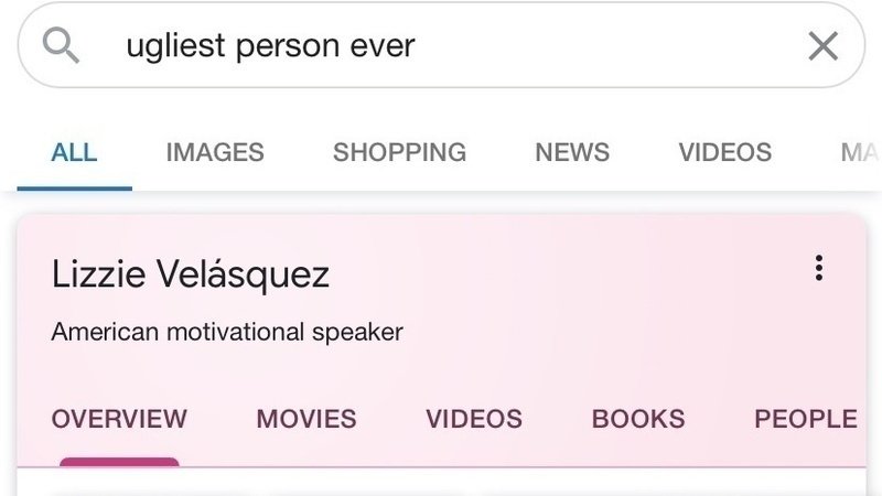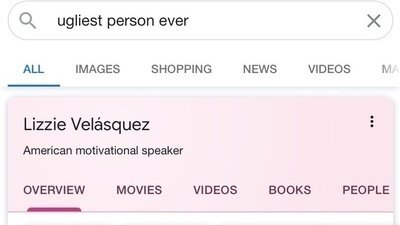 This is Lizzie Velásquez she is a motivational speaker. One way to search for her is by looking up “ugliest person ever” and that is unacceptable!! Google has her down as ugliest person ever, ask yourself if you were to search “ugliest person ever” and see your own face, wouldn’t you be hurt? That is rude and disrespectful. Everyone in this world is beautiful!! No one should be labeled “ugliest person ever” Lizzies pictures from there should be taken down! No one should go through that, Google do better!!