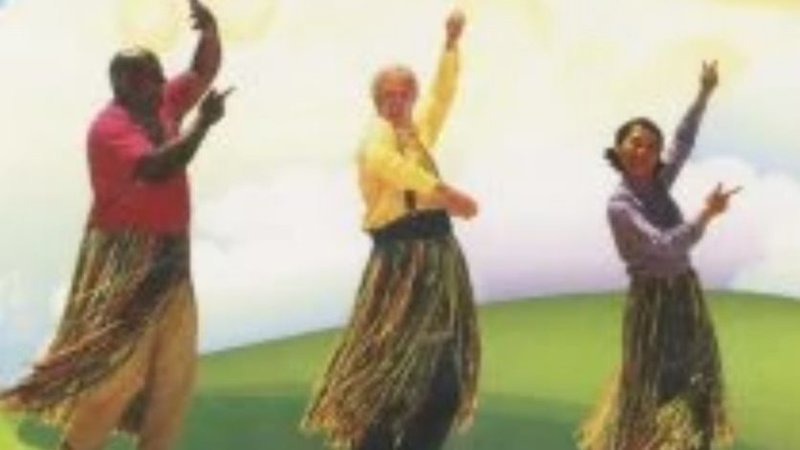 Grandpapa, Mr. Man and Auntie dance the hula in their grass skirts.