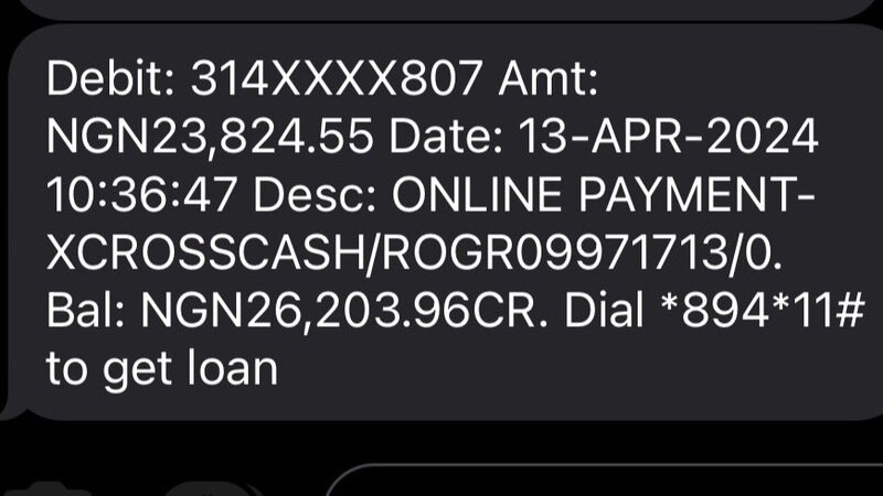 13, 2024 at exactly 10:36am I was debited a sum of N23,824.55 naira for an Online payment from XCROSSCASH. I immediately contacted my Bank (First Bank) customer care service, and directed to an agent who explained that my bank account number was used to apply for a loan which caused the debit from my account. I asked what could be done because I didn’t apply for a loan and didn’t receive any email or sms message as regards the loan application.