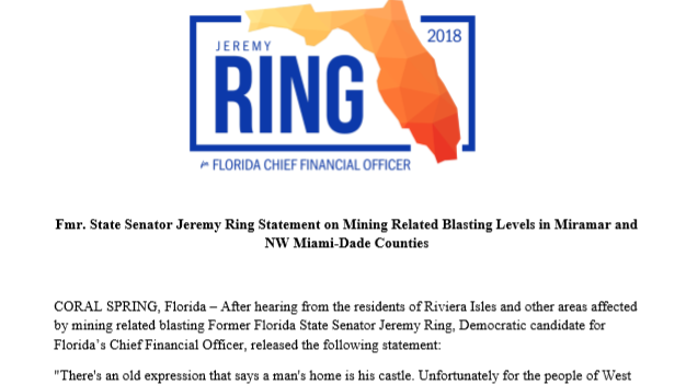 "CORAL SPRING, Florida – After hearing from the residents of Riviera Isles and other areas affected by mining related blasting Former Florida State Senator Jeremy Ring, Democratic candidate for Florida’s Chief Financial Officer, released the following statement: