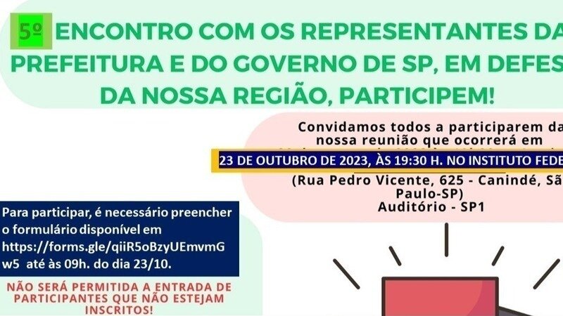 Convidamos toda a população para o "5º Encontro com os Representantes da Prefeitura e do Governo de São Paulo, em Defesa da Região".