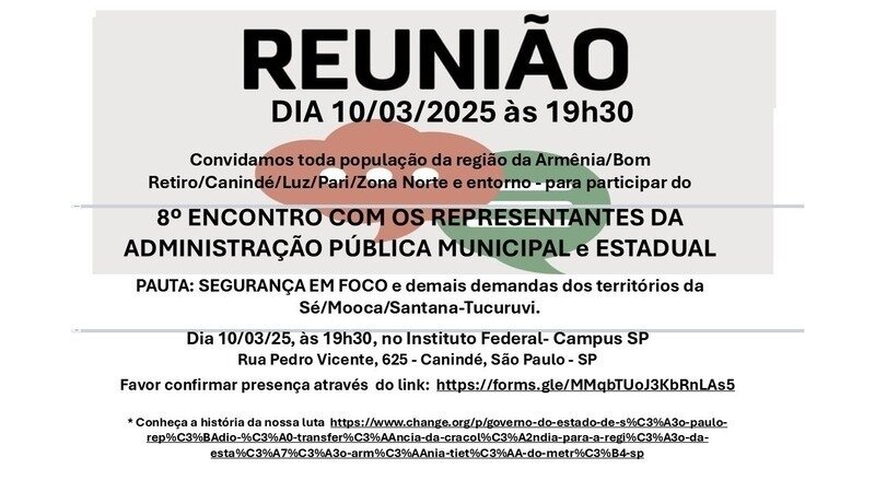 Convidamos toda a população da região - Armênia/Bom Retiro/Canindé/Luz/Pari/Zona Norte e entorno - para participar do 7º ENCONTRO COM OS REPRESENTANTES DA ADMINISTRAÇÃO PÚBLICA MUNICIPAL E ESTADUAL a fim de, juntos, darmos sequência na organização de uma eficaz força tarefa para resolver as demandas dos territórios.