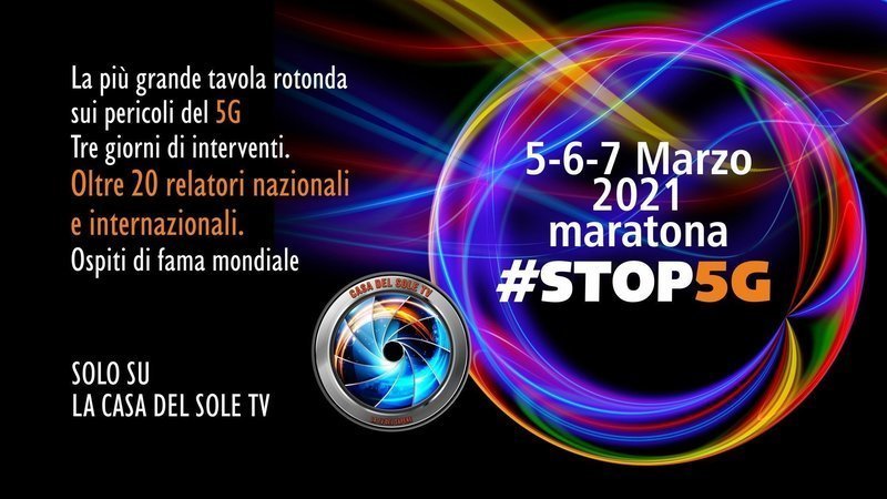 Alleanza Italiana Stop 5G e la Casa del Sole Tv organizzano la maratona Stop 5G. Si tratta di tre giorni consecutivi di interventi programmati per il fine settimana del 5-6-7 Marzo 2021.