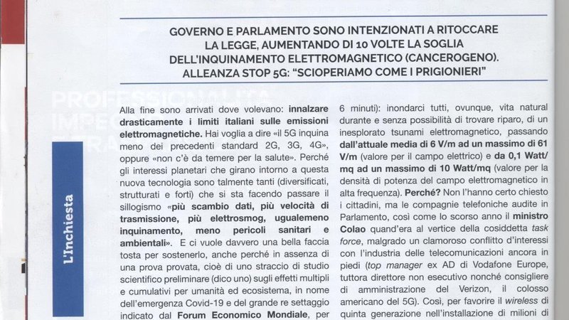 5G, APPELLO AI PARLAMENTARI DELLA REPUBBLICA ITALIANA PER SCONGIURARE L’INNALZAMENTO DEI LIMITI SOGLIA D’IRRADIAZIONE ELETTROMAGNETICA