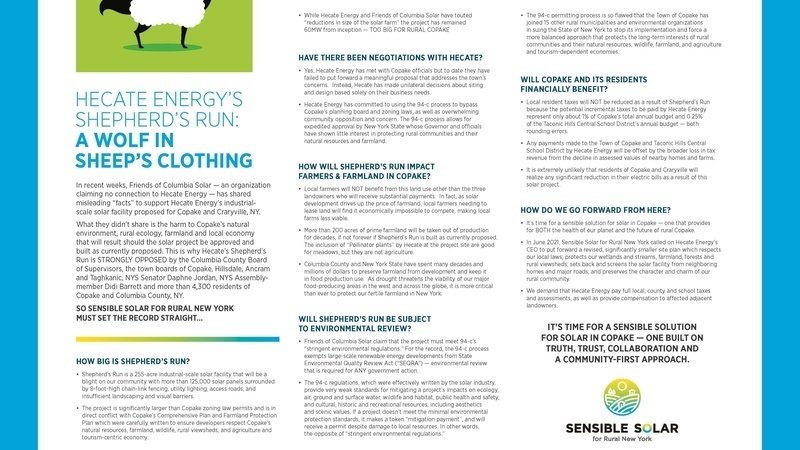 “Friends of Columbia Solar must not be allowed to mislead the public with one-sided information regarding the proposed Shepherd’s Run solar facility. The Town of Copake and its residents deserve the truth, and to understand the detrimental, long-term harm our community faces if Hecate’s Shepherd’s Run is approved as currently proposed,” said Darin Johnson, Sensible Solar for Rural New York. “More than 4,300 residents of Copake and Columbia County oppose the Shepherd’s Run project, and New York State officials must respect the laws and wishes of our state’s rural communities rather than favor out-of-state, for-profit developers. Fighting climate change can’t come at the expense of New York State’s rural communities, natural resources, farmland and economies.”