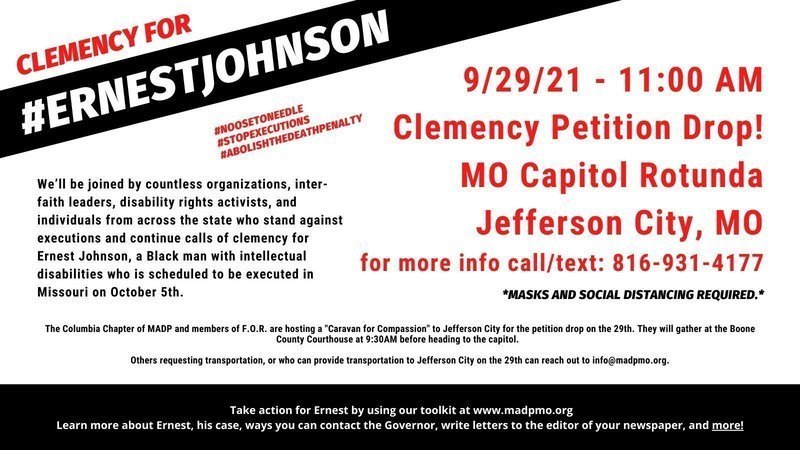 We are delivering petitions to Governor Parson that have been gathered from change.org/save-ernest-johnson on September 29th at 11AM in Jefferson City at the Missouri State Capitol Rotunda. We’ll be joined by several organizations, disability rights activists, and individuals from across Missouri who are imploring Governor Parson to grant Ernest Johnson clemency and commute his sentence to life. Learn more and join here!