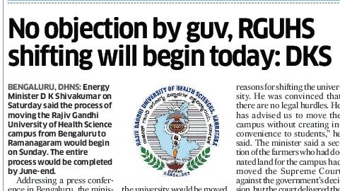 Now that the Government has arm twisted the University to shift in phased manner to Kandaya Bhavana in Ramanagar a temporary location till University shifts to its own campus which may take years since the land litigation woes are not yet completed and the cost for this temporary shift will cost RGUHS around Rs.5 crores which is a waste of University funds which could have been utilized for other academic activities.
