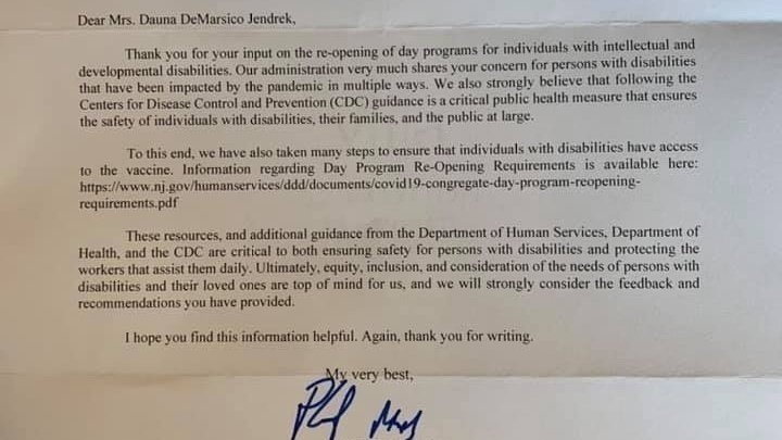 A handful of members of the Planning Protest in NJ Facebook Group received a letter in the mail as a response to their form submissions and emails. The letter indirectly addresses why a specific age group and specific group of adults with disabilities are not allowed to have their programs open whereas everyone else has the choice to attend their program or not. This is discrimination. The letters we all received were identical except for our addressed names.