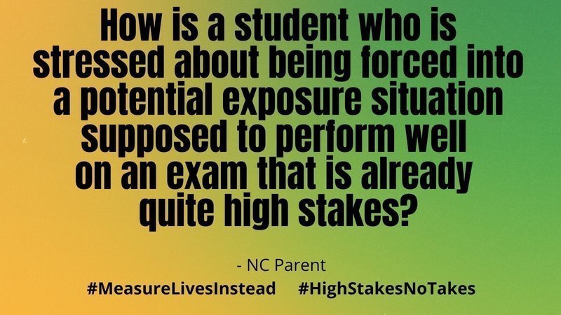 Join us on Twitter using #HighStakesNoTakes and #MeasureLivesInstead and follow @nctestingreform to join the tweet storm to draw more attention to the issue right now! Retweet the tweets to help share the message!