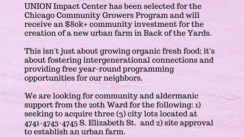 UNION Impact Center, the Office of the 20th Ward, and the city’s Department of Planning and Development have identified a potential location for the urban farm. The city owned lots under consideration are the following: 4741, 4743, and 4745 S. Elizabeth St.