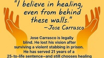 Jose Carrasco has spent 21 agonizing years of a 25-to-life sentence for a crime he did not commit. Jose is a legally blind and disabled individual who has survived traumatic experiences both prior to and during his incarceration. Despite these overwhelming hardships, Jose has not only sought transformation within himself but has also become an inspirational figure for others in dire circumstances.