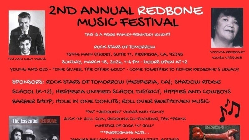 Our upcoming concert to honor the Tribal Elders of Rock 'n' Roll is only 13 days away! Doors open on Sunday, March 15, at 12 PM (Seating is limited). Come see many acts of SoCal pay homage to Pat "Redbone" Vegas and his fellow tribal elders: Lolly Vegas, Tony Bellamy, Pete DePoe, Arturo Perez, and Butch Rillera.