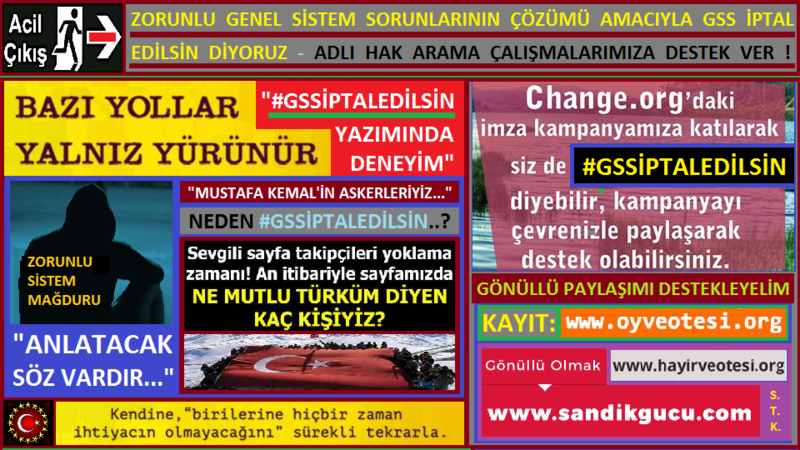ZORUNLU GENEL SİSTEM SORUNLARININ ÇÖZÜMÜ AMACIYLA #GSSİPTALEDİLSİN DİYORUZ: Değerli Vatandaşlarımız, Sistem mağdurları, Gönüllü destek veren kamuoyu, Cumhuriyet değerleri gelişimi için ortak noktada demokratik toplum çalışması yapan platformlar, Siyasi partiler, Sendikalar, Medya oluşumları, Gazeteler, Televizyon kuruluşları, Barolar, Birlikler, Teknik uzmanlar, Akademisyenler, Eğitimciler, Hukukçular ve Değişik ama benzer sistem mağduriyeti yaşayan kardeşlerimiz. Kısaca gündemi, sorunları, çözümü ve talepleri anlatacağız. Şu an mevcut siyasi, ekonomik ve zorunlu genel sağlık sigortası yada sosyal güvenlik sistemi; ülkemiz, toplum ve sistem nedeniyle mağduriyeti giderilmeyen kişiler için verimli olmamıştır. Mecliste ana muhalefet, orta muhalefet ve küçük muhalefet partilerinin yasa değişim önerileri dikkate alınmamıştır. Birçok soru önergesi red edilmiştir. Denetim raporları kamuoyuna bilgi vermiş değildir. Ekonomik çalışmalar tam olarak çözüm getiremedi. Bürokrasi masrafları ile bütçe denk gelemedi. Yargı ile mağduriyet çözümünü kapsayan net kararlar alındığı görülmedi. 2012 ve daha önceki yıllardan başlayan çeşitli çözülmeyen sorunlar var. TESPİT: Gelecek yerel yada genel seçimleri konuşuyoruz. Araya halk oylaması giriyor. Bazı şeylerin değişmesi için çaba veren kesim var. Bir kısım duyarlıdır. Diğer kısım olayı seyrine bırakmış. Burada verilen örnekleri biraz düşünmek gerekiyor. Toplumun üçte biri mağdur kesimdir. Hiç incelediniz mi bilmiyorum? Zorunlu çeşitli sistemler var. İşsize genel sağlık sigortası ve istihdam sorunu, işçiye asgari ücret ve memur gibi kesimlere göre düşük maaşı, emekliye bir millet vekili kadar sahip çıkamayan siyasi sistem var. SORUN: Sadece işsizler değil. İşçiler, emekliler, çiftçiler, esnaf ve ekonomik sistemde bulunan birçok kişi benzer şeyleri söylemektedir. Eşitsizlikler giderilmemiştir. İşsiz kişi mağdur olduğu kadar emekliler de gelirinden fazla gider sahibi olmuştur. Borçlu yaşayan kişiler arttı. Ayrıcalıklı yasama, yargı ve yürütme kurumuna ait kesimler artmıştır. Örneğin işsiz gss öderken, çalışan emekliliğini 5 - 10 sene geç olurken bu ve buna benzer işlemlerin; yasama üyelerine bakınca yada diğer zorunlu sistemlerde muafiyet kazanan kişilerin haklarına göre adil işlemler olmadığını düşünen kişiler artıyor. Kolay emeklilik, sağlık, maaş, sosyal haklar ile halktan uzak yaşayan kesimler var. Biz halk iken vekillerimiz kendi arasında ayrıcalık kazanmaya ve mevcut haklarını arttırmaya adaletsiz şekilde çözüm yaratıyor. Buna devam etmesi için seçimler sonucunda demokratik haklarımızı kullanarak onay yada halktan daha ayrıcalık kazanan kişi ve kurumlar için vicdanımız ile çok da hoşgörü gösterecek değiliz. Yapabileceğimiz demokratik ve haklı olduğumuz tercihe ait şeyleri kamuoyu olarak bir ortak karar alalım. Önümüzde bir genel seçim, yerel seçim ve buna ek cumhurbaşkanlığı seçimi var. Bu konuda kamuoyu zorunlu Gss iptali ile mağduriyetlerin tam olarak giderilmesine ait şartlarımızı bilmeden lütfen toplumsal bir tercih yapmasın. TALEP: 2012 yılından bu yana alınan yüksek zorunlu gss primleri iade edilsin. Sistem isteğe bağlı olsun. 25 yaşını geçen kimse mağdur edilmesin. Önceki sgk. sistemi nedeniyle mağdur kişiler ile sonrasında gss. borç silinmesi ile yapılan eşitsizlik ve mağdurlar arasında yer alan ayrıcalıkları mağdur etmesin. Mağduriyetler giderilmesi tam ve geçmişi kapsayan şekilde yapılsın. Toplumsal çalışma yapan siyasi partiler, sendikalar, gazete, basın, medya, dernek, televizyon, internet ve diğer kamuoyu sivil toplum oluşumları bunları okumadan ve destek vermeden lütfen yanıltıcı olacak açıklama yapmasın. Bunu mağdurlar kamuoyuna sorsun. Net yanıt almadan tercih yapmayın. Mağdurlar ortak karar alsın. Yazıyı okuyan okudum ve destek veriyorum diye paylaşım yapsın. DAVET: Yazımız ile çevrenizde net olarak Zorunlu Gss. Sorunlarına değinebilir misiniz? Borç silinmesi, isteğe bağlı olması ve ücretin iadesi için fikriniz ile Sgk, Emek, Gss. çözümü desteğiniz nedir? ZORUNLU SGK. VE GSS. MAĞDURLARININ ÇÖZÜM TALEBİ: Sgk, Gss, Eyt, İşsiz, İşçi, Bağ kur esnafı, Taşeron, Sgk. sorunu olan halk, Ev hanımları, Öğrenciler, Part time işçi olan, İşçi iken işsiz kalan çalışanlar, Mevsimlik işçiler, Geçici işçiler, İşsiz kalma riski ve Zorunlu Gss. sorunu yaşayanlar, Atanamayan yüksek okul mezunları, İşsiz olan ama Gss. sorunu anlatılmayan mezunlar, 18 yaşını geçenler, halen 25 yaşının üstünde öğrenci olanlar, Kademeli emekli mağduru işçi kesimi, Emeklilik mağduru ve emeklilere varıncaya kadar birçok çevre zorunlu Gss. sistem mağduru olmuştur. Bizden bazı çevre oluşumları taleplerimizi sormaktadır. Toplu olarak bize ulaşan talepleri aktaracağız. Lütfen not alınız. Yayın için ne kadar Gss. deki konuyu duyurursanız çözüm o kadar erken olur. İstenen ve Gss. için çözüm olacak noktaları sıralıyoruz. Zorunlu Gss. borçları silinsin, Gss.de sisteme istek varsa kayıt kabul etsin, Sgk. daki mağdurların geçmişte ödediği gss. pirim iadesi yapılsın. Gss. borçlusu olunan dönemde sağlık ücretleri ödemişse geri iade edilsin, yoksulluk sınırı asgari ücret güncel tutarına çıkarılsın. TWİTTER HASH TAGI İÇİN BİLGİ: GSS İPTAL EDİLSİN YAZIN. Değişiklik yok. Şimdi ve daha sonra çözüm buluncaya kadar aynı tagı kullanacağız. Şimdi ve devam eden süreçte yazım devam etsin. GSS BORÇLARINA GENEL İTİRAZ VE GSS ÇÖZÜM TALEPLERİ: Hane halkı için resen tescil ile kişisel gelir hesaplanması uygulaması vergilerin kişisel olması temeli ile geliri ve mal varlığı olmayan kişinin bulunduğu hanenin, evinin genel varlık ve