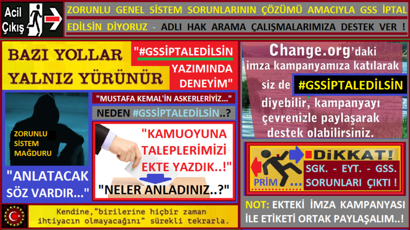 ZORUNLU GENEL SİSTEM SORUNLARININ ÇÖZÜMÜ AMACIYLA #GSSİPTALEDİLSİN DİYORUZ: Değerli Vatandaşlarımız, Sistem mağdurları, Gönüllü destek veren kamuoyu, Cumhuriyet değerleri gelişimi için ortak noktada demokratik toplum çalışması yapan platformlar, Siyasi partiler, Dernekler, İşçi yada işsiz arasında her türlü yapılan ortak çalışma konseyleri, Sendikalar, Sosyal medya kurumları, Görsel basın platformları, Çalışan duyarlılığı yada emeklilik için yapılan çalışma komisyonları, Gönüllü medya oluşumları, Gazeteler, Televizyon kuruluşları, Barolar, Eğitimciler, Birlikler, Teknik uzmanlar, Akademisyenler, Hukukçular ve Değişik ama benzer sistem mağduriyeti yaşayan kardeşlerimiz. Kısaca gündemi, sorunları, çözümü ve talepleri anlatacağız. Şu an mevcut siyasi, ekonomik ve zorunlu genel sağlık sigortası yada sosyal güvenlik sistemi; ülkemiz, toplum ve sistem nedeniyle mağduriyeti giderilmeyen kişiler için verimli olmamıştır. Mecliste ana muhalefet, orta muhalefet ve küçük muhalefet partilerinin yasa değişim önerileri dikkate alınmamıştır. Birçok soru önergesi red edilmiştir. Denetim raporları kamuoyuna bilgi vermiş değildir. Ekonomik çalışmalar tam olarak çözüm getiremedi. Bürokrasi masrafları ile bütçe denk gelemedi. Yargı ile mağduriyet çözümünü kapsayan net kararlar alındığı görülmedi. 2012 ve daha önceki yıllardan başlayan çeşitli çözülmeyen sorunlar var. TESPİT: Gelecek yerel yada genel seçimleri konuşuyoruz. Araya halk oylaması giriyor. Bazı şeylerin değişmesi için çaba veren kesim var. Bir kısım duyarlıdır. Diğer kısım olayı seyrine bırakmış. Burada verilen örnekleri biraz düşünmek gerekiyor. Toplumun üçte biri mağdur kesimdir. Hiç incelediniz mi bilmiyorum? Zorunlu çeşitli sistemler var. İşsize genel sağlık sigortası ve istihdam sorunu, işçiye asgari ücret ve memur gibi kesimlere göre düşük maaşı, emekliye bir millet vekili kadar sahip çıkamayan siyasi sistem var. SORUN: Sadece işsizler değil. İşçiler, emekliler, çiftçiler, esnaf ve ekonomik sistemde bulunan birçok kişi benzer şeyleri söylemektedir. Eşitsizlikler giderilmemiştir. İşsiz kişi mağdur olduğu kadar emekliler de gelirinden fazla gider sahibi olmuştur. Borçlu yaşayan kişiler arttı. Ayrıcalıklı yasama, yargı ve yürütme kurumuna ait kesimler artmıştır. Örneğin işsiz gss öderken, çalışan emekliliğini 5 - 10 sene geç olurken bu ve buna benzer işlemlerin; yasama üyelerine bakınca yada diğer zorunlu sistemlerde muafiyet kazanan kişilerin haklarına göre adil işlemler olmadığını düşünen kişiler artıyor. Kolay emeklilik, sağlık, maaş, sosyal haklar ile halktan uzak yaşayan kesimler var. Biz halk iken vekillerimiz kendi arasında ayrıcalık kazanmaya ve mevcut haklarını arttırmaya adaletsiz şekilde çözüm yaratıyor. Buna devam etmesi için seçimler sonucunda demokratik haklarımızı kullanarak onay yada halktan daha ayrıcalık kazanan kişi ve kurumlar için vicdanımız ile çok da hoşgörü gösterecek değiliz. Yapabileceğimiz demokratik ve haklı olduğumuz tercihe ait şeyleri kamuoyu olarak bir ortak karar alalım. Önümüzde bir genel seçim, yerel seçim ve buna ek cumhurbaşkanlığı seçimi var. Bu konuda kamuoyu zorunlu Gss iptali ile mağduriyetlerin tam olarak giderilmesine ait şartlarımızı bilmeden lütfen toplumsal bir tercih yapmasın. TALEP: 2012 yılından bu yana alınan yüksek zorunlu gss primleri iade edilsin. Sistem isteğe bağlı olsun. 25 yaşını geçen kimse mağdur edilmesin. Önceki sgk. sistemi nedeniyle mağdur kişiler ile sonrasında gss. borç silinmesi ile yapılan eşitsizlik ve mağdurlar arasında yer alan ayrıcalıkları mağdur etmesin. Mağduriyetler giderilmesi tam ve geçmişi kapsayan şekilde yapılsın. Toplumsal çalışma yapan siyasi partiler, sendikalar, gazete, basın, medya, dernek, televizyon, internet ve diğer kamuoyu sivil toplum oluşumları bunları okumadan ve destek vermeden lütfen yanıltıcı olacak açıklama yapmasın. Bunu mağdurlar kamuoyuna sorsun. Net yanıt almadan tercih yapmayın. Mağdurlar ortak karar alsın. Yazıyı okuyan okudum ve destek veriyorum diye paylaşım yapsın. DAVET: Yazımız ile çevrenizde net olarak Zorunlu Gss. Sorunlarına değinebilir misiniz? Borç silinmesi, isteğe bağlı olması ve ücretin iadesi için fikriniz ile Sgk, Emek, Gss. çözümü desteğiniz nedir? ZORUNLU SGK. VE GSS. MAĞDURLARININ ÇÖZÜM TALEBİ: Sgk, Gss, Eyt, İşsiz, İşçi, Bağ kur esnafı, Taşeron, Sgk. sorunu olan halk, Ev hanımları, Öğrenciler, Part time işçi olan, İşçi iken işsiz kalan çalışanlar, Mevsimlik işçiler, Geçici işçiler, İşsiz kalma riski ve Zorunlu Gss. sorunu yaşayanlar, Atanamayan yüksek okul mezunları, İşsiz olan ama Gss. sorunu anlatılmayan mezunlar, 18 yaşını geçenler, halen 25 yaşının üstünde öğrenci olanlar, Kademeli emekli mağduru işçi kesimi, Emeklilik mağduru ve emeklilere varıncaya kadar birçok çevre zorunlu Gss. sistem mağduru olmuştur. Bizden bazı çevre oluşumları taleplerimizi sormaktadır. Toplu olarak bize ulaşan talepleri aktaracağız. Lütfen not alınız. Yayın için ne kadar Gss. deki konuyu duyurursanız çözüm o kadar erken olur. İstenen ve Gss. için çözüm olacak noktaları sıralıyoruz. Zorunlu Gss. borçları silinsin, Gss.de sisteme istek varsa kayıt kabul etsin, Sgk. daki mağdurların geçmişte ödediği gss. pirim iadesi yapılsın. Gss. borçlusu olunan dönemde sağlık ücretleri ödemişse geri iade edilsin, yoksulluk sınırı asgari ücret güncel tutarına çıkarılsın. TWİTTER HASH TAGI İÇİN BİLGİ: GSS İPTAL EDİLSİN YAZIN. Değişiklik yok. Şimdi ve daha sonra çözüm buluncaya kadar aynı tagı kullanacağız. Şimdi ve devam eden süreçte yazım devam etsin. GSS BORÇLARINA GEN