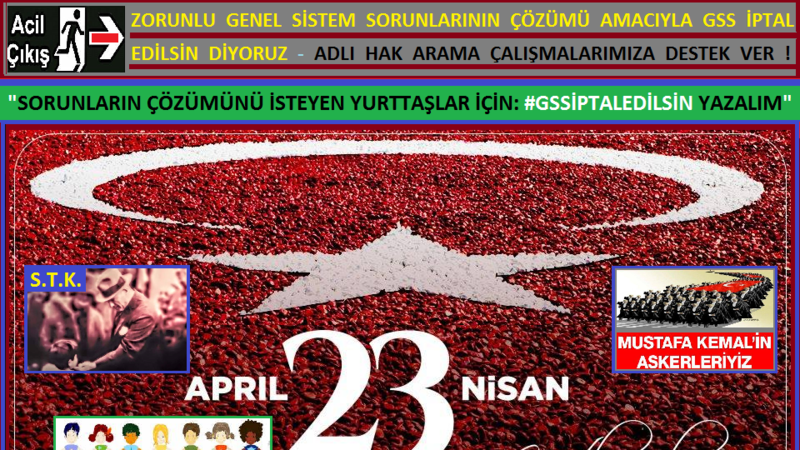 ZORUNLU GENEL SİSTEM SORUNLARININ ÇÖZÜMÜ AMACIYLA #GSSİPTALEDİLSİN DİYORUZ: https://www.change.org/p/zorunlu-genel-sistem-sorunlarının-çözümü-amacıyla-gss-iptal-edilsin-diyoruz STK: #23NisanKutluOlsun #23NisanUlusalEgemenlikveÇocukBayramı #23Nisan #UlusalEgemenlikveÇocukBayramı #23ThAprilTurkishChildrensDay #TurkishChildrensDay #MustafaKemalinAskerleriyiz