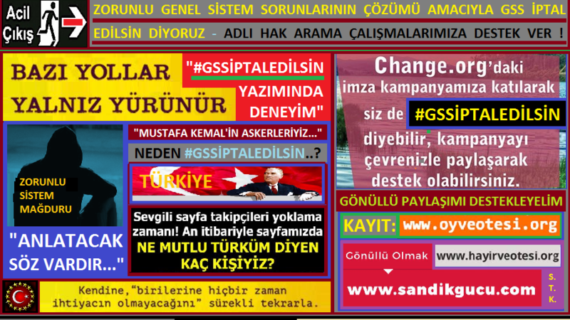 ZORUNLU GENEL SİSTEM SORUNLARININ ÇÖZÜMÜ AMACIYLA #GSSİPTALEDİLSİN DİYORUZ: https://www.change.org/p/zorunlu-genel-sistem-sorunlarının-çözümü-amacıyla-gss-iptal-edilsin-diyoruz ORTAK TALEPLERİMİZ: Ortak ve bireysel olmayan isteklerimizi anlaşılması adına tekrar ediyoruz. Bunlar için ortak düşüncemiz var. Bizler Kesinlikle, ÖZEL HAK PEŞİNDE DEĞİLİZ ve ayrıcalık için çalışma istemiyoruz. Bir kısım işsiz, bir kısım çalışan, bir kısım emekli, bir kısım esnaf, bir kısım çiftçi yada ailesinde bu şekilde mağdur edilmiş insanların sesi olduk. Biz sadece 1999 yılı öncesi için değil, tüm çalışan yada işsiz kişiler için ortak kalkınma çalışması amacıyla duyarlılık gösteriyoruz. Emekliler için yine haklarını alması için çaba gösteriyoruz. İşsizlerin zorunlu gss sorunu haricinde çalışma hayatında uğradığı mağduriyetlerin yine takipçisiyiz. İşsizlere her ay Gss ödetilmesine karşıyız. Emekliler için maaşlarından sağlık kesintisi de uygun değil diye düşünüyoruz. Bireysel değiliz. Ortak şeyler için konuşma yapıyoruz. Çalışanlar yönünden 1999 yılında mağdur eden sgk sistemleri için sözümüz var. Bu konuda biz; ERKEN EMEKLİLİK DEĞİL, 1999 yılında 4447 sayılı yasanın geriye doğru işletilmesi sonucu elimizden alınan, GECİKTİRİLMİŞ HAKKIMIZ OLAN EMEKLİLİĞİMİZİ İSTEYENLERİZ. 8 Eylül 1999 tarihinden önce, SSK, Bağ-Kur ya da Emekli Sandığı’na bağlı olarak çalışma hayatına başlarken emeklilik için iki şart bulunuyordu: Bunlardan biri hizmet yılı, diğeri ise prim gün sayısı idi. Bu da kadınlarda 20 yıl 5 bin gün, erkeklerde ise 25 yıl 5 bin gün olarak belirlenmişti.DSP, ANAP ve MHP’nin oluşturduğu dönemin üçlü koalisyon hükümeti, 1999 yılında 4447 sayılı yasa ile emeklilik için yaş şartı getirdi. Esas mağduriyet, bu yasanın yürürlüğe girdiği tarihten itibaren değil, geriye doğru işletilmesinden kaynaklandı. 23 Şubat 2001 tarihinde, dönemin muhalefet partisi olan Fazilet Partisi’nin Anayasa Mahkemesi’ne başvurması ile yasanın bazı maddeleri iptal edildi. Ancak emeklilik “Kazanılmış hak değil beklenen haktır” denilerek, 23 Mayıs 2002’de 4759 sayılı yasa ile kademeli yaş şartları belirlendi ve uygulamaya konuldu.Mağdur edilenlerin sayısı 5 milyon kişi idi. Yasanın çıktığı tarihten günümüze kadar emekli olanları çıkardığımızda, 2 milyon 400 kişi kalıyor. Bunların arasından hemen emekli olacaklar yaklaşık 250-300 bin kişi. Her türlü platformlarda hak arayışımıza devam ederken, 2008 yılında 5510 sayılı kanunla aylık bağlama oranlarının 1999 öncesi, 2000-2008 arası ve 2008 sonrası olmak üzere üç kademeye ayrılarak hesaplanmasıyla ortalama % 70 olan oran, % 30’lara düştü. Bu yasaya bağlı olarak primleri asgari ücret ve biraz üstünde yatan kişilerden emekli olacaklara bugün bağlanan maaş aralığı 700 ile 1000 TL arasındadır. Hal böyleyken mağduriyetler artarak devam etti. Emeklilik hakkımız ötelendi. Bu oranlara göre bağlanan emeklilik maaşları düştü. Yaş haddinden çalışma hayatında ikinci tura dönen Asgari ücretle çalışanların pirim ödeme gün sayılarının fazla olması nedeniyle bağlanacak emekli maaşlarıda düştü. Maaşların düşmemesi için sigortasız çalışmayı kabul eden çalışanlar işsizken genel sağlık sigortasına tabi tutulması nedeniyle sosyal, ekonomik ve psikolojik sorunlar yaşamaya başladılar. Verilen yasa önergelerine kayıtsız kalınıp desteklenmedi. Mağduriyetimiz devam etmektedir. Peki; Emeklilikte Yaşa Takılanlar Ne İstiyorlar? Bizim mücadelemizin amacı erken emekli olmak değil, elimizden alınan hakları geri almaktır. Geçmişe dönük olarak uygulanan yasa gereği ve aylık bağlama oranlarının düşürülmesi ile mağdur olanların mağduriyetlerinin giderilmesi gerektiğine inanıyor bunun için çalışıyoruz. Amacımız, emeklilikte hem yaş hem maaş engeline takılan tüm çalışanların gelecekte rahat ve huzurlu bir hayat sürdürebilmesi için tüm gücümüzle, kırmadan, dökmeden, incitmeden, siyaset üstü, ilkeli ve akılcı bir yöntemle hak arayışımızı çeşitli etkinliklerle duyurmak. Bu amacımızın gerçekleşmesi içinde ülke genelinde örgütlenerek hak arayışımızda ki mücadelemize güç kattık. Ülkenin yönetiminden sorumlu olan iktidarların, siyasi otoritelerin, kamu kurum ve kuruluşlarının, sivil toplum örgütleri ile yerel yönetimlerinin, EMEKLİLİKTE YAŞA TAKILANLARIN mağduriyetlerinin giderilmesinde kayıtsız kalmamalarını ve acilen çözüm üretmelerini istiyoruz. Ülkenin yönetiminden sorumlu olan iktidarların, siyasi otoritelerin, kamu kurum ve kuruluşlarının, sivil toplum örgütleri ile yerel yönetimlerin, EMEKLİLİKTE YAŞA TAKILANLARIN - GSS - SGK - EMEKLİ - İŞÇİ - ÇALIŞAN - İŞSİZ - ESNAF - ÇİFTÇİ - ÜRETEN - EMEKÇİ yani ülke emektarlarının mağduriyetlerinin giderilmesinde kayıtsız kalmamalarını ve acilen çözüm üretmelerini istiyoruz. ZORUNLU GENEL SİSTEM SORUNLARININ ÇÖZÜMÜ AMACIYLA #GSSİPTALEDİLSİN DİYORUZ: https://www.change.org/p/zorunlu-genel-sistem-sorunlarının-çözümü-amacıyla-gss-iptal-edilsin-diyoruz