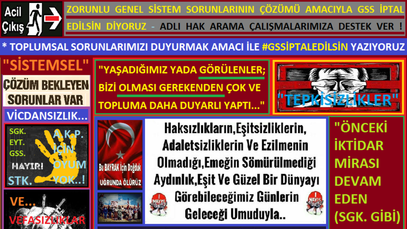 Petition updateZorunlu Genel Sistem Sorunlarının Çözümü Amacıyla Gss İptal Edilsin Diyoruz !EMEK VE İNSANLIK BAYRAMI: ZORUNLU GENEL SİSTEM SORUNLARININ ÇÖZÜMÜ AMACIYLA #GSSİPTALEDİLSİN DİYORUZ