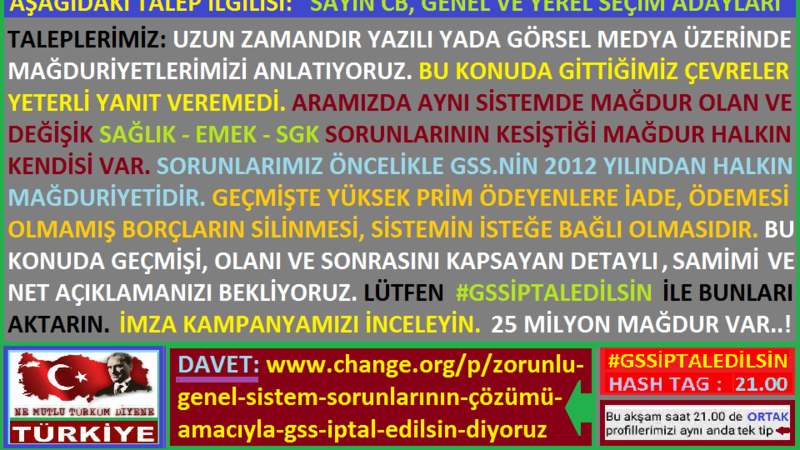 TOPLUMSAL SORUNLARA: #TAMAM DEDİK. BURADA BULUŞTUK. AYNI AY YILDIZLI BAYRAK ALTINDAYIZ. BU VATANIN DÜRÜST EVLATLARIYIZ. ORTAK DÜŞÜNCEMİZ VAR. HEPİMİZ SORUNLARI SİSTEM İÇİNDE GENEL DÜŞÜNDÜK. YAPICI ŞEKİLDE HAKLARIMIZI DEMOKRATİK OLARAK KULLANARAK BU SORUNLARI ÇÖZMEYE KARAR VERDİK. ÇÜNKÜ SİSTEMSEL BAZI ŞEYLERDEN MAĞDURUZ. DUYARLI OLDUK. ÇÖZÜM İSTEDİK. ORTAK VE ÇÖZÜM MESAJIMIZI YİNELEDİK. BENZER ŞEYLERDEN MAĞDUR OLDUĞUMUZ İÇİN EMEK, SGK, GSS, TÜKETİCİLİK, EYT, VATANDAŞLIK YADA SAĞLIK HAKLARI SORUNLARI GİBİ ORTAK KONULAR İÇİN TALEPLERİMİZ VAR. UMUTLUYUZ. HER ZAMAN BİRLİK OLACAĞIZ. CUMHURİYET İÇİN DUYARLIYIZ. KARDEŞLİK İSTİYORUZ. GAZİ MUSTAFA KEMAL ATATÜRK'ÜN ASKERLERİYİZ. TEKRARLIYORUZ: "ZORUNLU GENEL SİSTEM SORUNLARININ ÇÖZÜMÜ AMACIYLA #GSSİPTALEDİLSİN DİYORUZ" Sgk. ve Gss. sistemi içinde işsizlikten, çalışana, işçiye, emekli hakkı sonradan çıkan yasalar ile elinden alınan emeklilik mağduruna, emekliye kadar henüz çözülmeyen değişik genel sistem sorunlarına ait sistemsel mağduriyet var. İşsizlerin, çalışanın, emekli olamayanın, işçilerin, esnafın, çiftçinin, ataması yapılmayan yüksek okul mezunlarının, emeklilik sonrası için sistemsel sorunlara demokratik ve hukuksal açıdan vatandaş olarak itiraz ediyoruz. Etiketi ve imza kampanyasını duyuralım? Lütfen imza kampanyasına katılın? Saat: 21.00 için ortak paylaşalım. TALEP: İmza kampanyamıza katılalım? Talepleri okuyalım? Kamuoyu olarak destek bekliyoruz? Kamuoyuna çağrıyı okudunuz mu? Borçların silinmesi, isteğe bağlı olması ve ücretin iadesi için fikriniz ile Sgk, Emek, Sağlık, Eyt, Gss. çözümü desteğiniz nedir? Lütfen en az bir kez paylaşın. İmza kampanyasına katılın. Sosyal çevrenizi davet edin. Paylaşım için gönüllü çevresi oluşturalım? STK: Ülkemizde, hak mücadelesinde; Bizim; özgür, adil ve eşit bir dünya umudumuz asla yenilmedi. Yenilmeyecek. Biz; insanca ve hakça bir düzeni bir gün mutlaka var edeceğiz! Bu duygular ile işsizden, çalışana, atanamayan yüksek okul mezunlarından işçilere, esnaftan çiftçiye, emekli edilmeyen emeklilik mağdurlarından emekliye, emeklilerden milletvekillerine kadar eşitsizlik olan ve adaletsiz duran tüm sistemler için duyarlı olacağız. Yoksulluğu önlemeye çalışacağız. Her vatandaş yoksulluk seviyesinden kurtulmalıdır. Bunu siyaset dışında, ortak duyarlılık çatısında, ortak al yıldızlı bayrağımız altında, cumhuriyet ilkelerimizi yüceltmek samimiyeti içinde, tarihimize saygı duyarak, aynı ortak vatan değerleri üzerinde ve kardeşlik ortamı içinde cumhuriyet değerlerine bağlı olarak paylaşacağız. MAĞDUR EDEN HER SORUNA BİZ BURADA ORTAK ŞEKİLDE: #TAMAM DEDİK. MESAJIMIZI TEKRARLIYORUZ. MESAJIMIZ VAR: "ZORUNLU GENEL SİSTEM SORUNLARININ ÇÖZÜMÜ AMACIYLA #GSSİPTALEDİLSİN DİYORUZ" LÜTFEN BUNU ÜYESİ VE KATILIMCI OLDUĞUNUZ ORTAMLARDA YAZIN: ZORUNLU GENEL SİSTEM SORUNLARININ ÇÖZÜMÜ AMACIYLA #GSSİPTALEDİLSİN DİYORUZ: https://www.change.org/p/zorunlu-genel-sistem-sorunlarının-çözümü-amacıyla-gss-iptal-edilsin-diyoruz