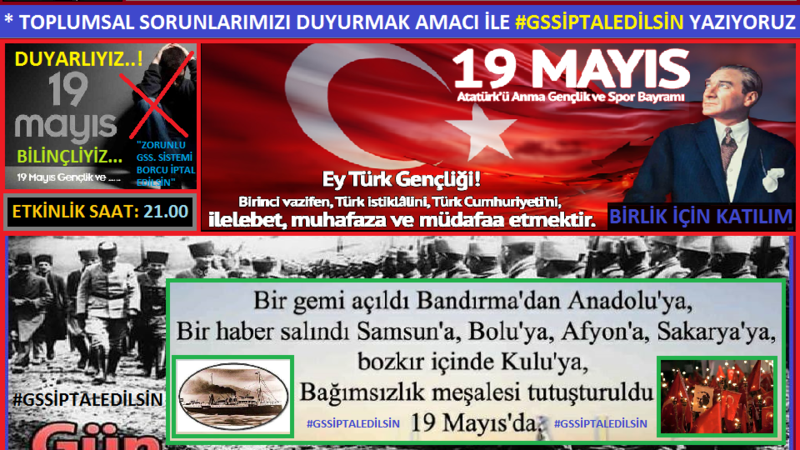 TOPLUMSAL MAĞDURİYETLERE #TAMAM VE ZORUNLU GENEL SİSTEM SORUNLARININ ÇÖZÜMÜ AMACIYLA #GSSİPTALEDİLSİN DİYORUZ: https://www.change.org/p/zorunlu-genel-sistem-sorunlarının-çözümü-amacıyla-gss-iptal-edilsin-diyoruz TALEP:Zorunlu Sgk.sistemine ait halka yapılan engel kalksın,borç silinsin,ödeyenlere iade,ücretsiz sağlık için imza attınız mı?#ADAYLARASORUYORUM TEŞEKKÜR: 19 mayıs için kutlama. MESAJ: “Değerli Cumhuriyet Emekçilerimiz ve Çok Kıymetli Takipçilerimiz, Asil Türk milletinin; son derece onurlu ve bir o kadar da sorumluluk gerektiren, duyarlılık vazifesini çok fedakârca yerine getiren ve yine vatan sever duruşundan taviz vermeyen, tüm saygı değer gençlerimizin: “19 Mayıs Günü”nü, en içten duygularımızla kutluyoruz. Ebedî Başkomutanımız Gazi Mustafa Kemal ATATÜRK’ün “Bütün ümidim gençliktedir” vecizesi; değerli gençlerimizin; millet, toplum ve geleceğimiz için taşıdığı önemi, açık bir şekilde ortaya koymaktadır. Bu emanete layığı ile sahip çıkmış olan Türk gençliği, bundan sonraki dönemlerde de bu görevini en güzel şekilde yerine getirecektir. Bundan hiç kimsenin kuşkusu yoktur. Milletimizin, devletimizin kurtuluş ve kuruluşunun mimarı Gazi Mustafa Kemal ATATÜRK’ün gençliğe güvenci tamdır. Onları yetiştiren en başta aileleridir; köklü tarihimize değer katan değerli büyüklerimizi yetiştiren öğretmenlerimiz ile hepimizi bugünlere eriştiren; şehit ve gaziler başta olmak üzere hepimizin, bütün tarihimize daima en yüksek saygı ve en derin sevgiyi göstermesi, en anlamlı görevlerimiz arasında yer almaktadır. Toplum yapısının asli unsuru olan gençlerimiz, yüreğinde taşıdığı vatan sevgisini ve gereken duyarlılığı göstermekten kaçınmamıştır. Yeri geldiğinde ise; Kurtuluş Savaşı’nın unutulmaz kahramanlarından sayılan gençlerimiz; milletin selametini, daima kendi selametinden bile önce tutmuştur. Ülkemiz; Cumhuriyetimizin gözbebekleri gibi bakıp yetiştirdikleri Mehmetçiklerimizi, “önce vatan” diyerek peygamber ocağına uğurlamanın haklı gururunu yaşayan fedakâr annelerimizin sevgi, güven ve desteğinden aldığı güçle; bayraklaşan vatan topraklarının, millî birlik ve beraberliğin, ülke huzur ve güvenliğinin en önemli güvencesi olmaya devam edecektir. Bu anlamlı gün vesilesiyle başta bizleri vatan, millet ve yüksek değerlerimiz uğrunda sorumluluk ve görev üstlenmek üzere yetiştiren saygıdeğer ailelerimiz; çocuklarımızı millî kültürümüz çerçevesinde yetiştiren ve huzur içerisinde çalışmamıza imkân tanıyan öğretmenlerimiz, gençlerimize her zaman destek olanlar, kıymetli gönüllülerimiz olmak üzere; Cumhuriyet'imizi emanet edeceğimiz tüm sevgili gençlerimizin “19 Mayıs Günü”nü bir kez daha kutluyor; ebediyete genç yaşında intikal etmiş olanlar ve bütün vatan severlerimizi bu önemli günümüzde saygı ve rahmetle anıyoruz. Bağımsızlık ve özgürlük savaşının fiilen başladığı 19 Mayıs, Türk Ulus’unun da uyanışıdır. Emeği geçen Cumhuriyet Dostlarına teşekkür ederek, sevgi ve saygılarımızı sunuyoruz” - Lütfen paylaşım yapalım! TOPLUMSAL MAĞDURİYETLERE #TAMAM VE ZORUNLU GENEL SİSTEM SORUNLARININ ÇÖZÜMÜ AMACIYLA #GSSİPTALEDİLSİN DİYORUZ: https://www.change.org/p/zorunlu-genel-sistem-sorunlarının-çözümü-amacıyla-gss-iptal-edilsin-diyoruz