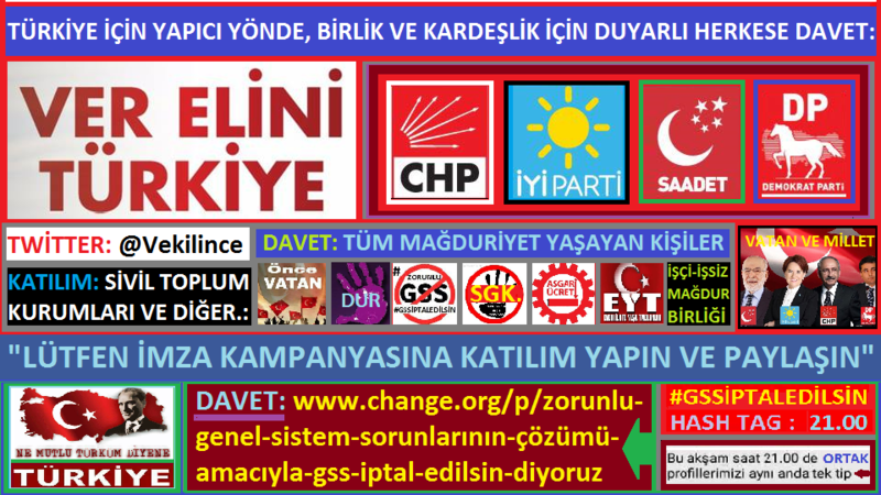 https://www.change.org/p/zorunlu-genel-sistem-sorunlarının-çözümü-amacıyla-gss-iptal-edilsin-diyoruz SANDIK GÜCÜ WHATSAPP HATTI: 0 536 520 19 23 ile gönüllü müşahit olabilirsiniz! CUMHURBAŞKANLIĞI SEÇİMİ TERCİHİ: Cumhurbaşkanlığı adayı olarak Sn.Muharrem İnce, Sn.Meral Akşener veya Sn.Temel Karamollaoğlu olacaktır. MİLLET VEKİLİ SEÇİMLERİ TERCİHİ: Genel seçim için millet vekili adayları ise; Millet İttifakı arasında yer alan üye siyasi kurumlardan: Chp, İyi Parti, Saadet Partisi ve Demokrat Parti arasından seçilmektedir. DUYURU: Değerli Dostlarımız, Bir dava neferi olarak biz yarın Maltepe’de olacağız.Sizleri de bir kez daha orada olmaya, yeni Cumhurbaşkanımız Muharrem İnce’yi selamlamaya ve geleceğin huzurlu Türkiye’sinin zafer yürüyüşüne şahitlik etmeye çağırıyoruz. Saygılarımla, Zorunlu Genel Sistem Mağdurları Sözcüsü. Zorunlu Gss İptal Edilsin ve Tamam Dayanışması. Basın Açıklaması. DAVET: Biz Maltepe’de Olacağız! Siz de Orada Olun!