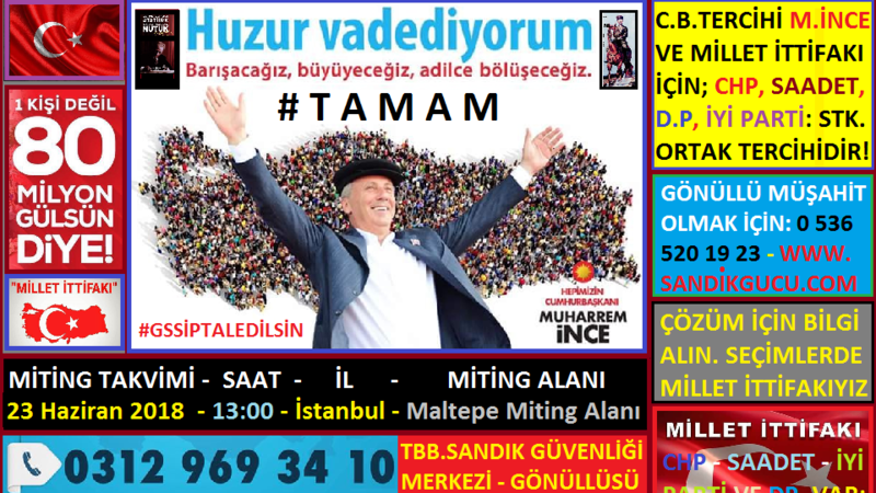 #TAMAM diyoruz. ETKİNLİK: 23 Haziran için kamuoyu için ortak birlik ve kardeşlik katılımı var. VİDEO YAYINI: https://youtu.be/03yRnuzJaZ0?t=4 İMZA KAMPANYASI DAVETİ: https://www.change.org/p/zorunlu-genel-sistem-sorunlarının-çözümü-amacıyla-gss-iptal-edilsin-diyoruz SANDIK GÜCÜ WHATSAPP HATTI: 0 536 520 19 23 ile gönüllü müşahit olabilirsiniz! CUMHURBAŞKANLIĞI SEÇİMİ TERCİHİ: Cumhurbaşkanlığı adayı olarak Sn.Muharrem İnce, Sn.Meral Akşener veya Sn.Temel Karamollaoğlu olacaktır. MİLLET VEKİLİ SEÇİMLERİ TERCİHİ: Genel seçim için millet vekili adayları ise; Millet İttifakı arasında yer alan üye siyasi kurumlardan: Chp, İyi Parti, Saadet Partisi ve Demokrat Parti arasından seçilmektedir. DUYURU: Değerli Dostlarımız, Bir dava neferi olarak biz yarın Maltepe’de olacağız. Sizleri de bir kez daha orada olmaya, yeni Cumhurbaşkanımız Muharrem İnce’yi selamlamaya ve geleceğin huzurlu Türkiye’sinin zafer yürüyüşüne şahitlik etmeye çağırıyoruz. Saygılarımla, Zorunlu Genel Sistem Mağdurları Sözcüsü. Zorunlu Gss İptal Edilsin ve Tamam Dayanışması. Basın Açıklaması. DAVET: Biz Maltepe’de Olacağız! Siz de Orada Olun! Kitleleri harekete geçirmek, aynı duyguyu aynı anda milyonlarca insanın yüreğine yazmak zordur. Ancak öyle zamanlar gelir ki “bir küçük adım” vesile olur, bir haykırış “yol gösterir” ve onlarca yıl devam eden karamsarlık “bir anda” dağılıverir. İşte bugünlerde yaşanan “dip dalgasının”, kitlelerin kalplerinde yeşeren “iktidar umudunun” sebebi de budur. Artık tüm eşikler aşıldı. Karamsarlık duvarları yerle bir oldu. Düne kadar mağlubiyetlerin sessizliğe gömdüğü tüm toplum kesimleri “iktidar” talebiyle yollarda. Yepyeni bir dönemin ayak sesleri bunlar. Daha adil, daha özgür, her anlamda daha eşit bir ülke yaratmak isteyen milyonlarca insanın “büyük zafer yürüyüşü” tüm yaşananlar. Havada süzülen bir ok gibi, tüm Cumhuriyet sevdalıları hedefe kilitlenmiş durumda. Ve atacağımız son birkaç adımla beraber yepyeni bir sayfa açılmak üzere. Son Adımları Atmaya Hazır Olun! Bugüne kadar yapılan bütün çalışmalar “insanüstü” bir gayretin göstergesiydi, ama biraz daha gayret göstermek gerekli. Zira zafere ulaşmak için önümüzde sadece birkaç metre ve birkaç adım kaldı. Bu adımların en büyüğü ve en görkemli olması gerekeni Cumhurbaşkanı adayımız Sayın Muharrem İnce’nin yarın (23 Haziran) Maltepe’de gerçekleştireceği büyük miting. Çok kısa zamanda yaklaşık 100’ü aşkın miting yapan geleceğin Cumhurbaşkanı Muharrem İnce’yi, o meydanda birkaç milyon kişiyle karşılamak yetmez. Öyle bir kalabalık olmalı ki Edirne’den Kars’a, Hakkari’den Muğla’ya kadar Türkiye’nin her yanındaki haksızlığa uğramışlar, ataması yapılmayanlar, mülakatlarda elenenler, emeği gasp edilenler, alın teri yok sayılanlar, geleceği çalınanlar, yandaşlarına yer açmak için bir kenara atılanlar “Tamam” diyebilsinler ve büyük bir özgüvenle “zafer yürüyüşünü” tamamlayabilsinler. Yarın Maltepe’de öyle bir kalabalık olmalı ki akıllarında küçük soru işareti olan herkesin zihni berraklaşsın, tüm soru işaretleri ortadan kalksın. Öyle bir kalabalık olmalı ki yandaş medya hangi açıyı kullanırsa kullansın, hangi saatte meydanın fotoğrafını çekerse çeksin sadece ve sadece “iktidara susamış” milyonlarca insanın Türk Bayraklarıyla oluşturduğu bir insan denizi görsünler. Zira Maltepe’de sadece bir miting olmayacak, Maltepe’de Türkiye’nin yarınlarına imzalarını atacak milyonlarca insanın zafere giden son ve kararlı adımları atılacak. Lütfen siz de bu tarihi güne ortak olun. Onlarca yıl boyunca unutulmayacak olan bu tarihi günde iktidara giden yolun son adımlarını atmaya hazır olun! Maltepe’de Yanacak Meşale Tüm Türkiye’ye İlham Verecek. Yarın Maltepe’de her yaştan milyonlarca Cumhuriyet sevdalısıyla zafer şarkıları söyleyecek olanlara şimdiden müjdeli bir haberim var: Sizin söyleyeceğiniz her şarkı dilden dile tüm ülkeyi dolaşacak. Yaktığınız özgürlük ve adalet meşalesi tüm Türkiye’ye ilham verecek. Sizlerin kararlılığı sayesinde, emin olun, asla şüpheye düşmeyin, 81 ilin tüm sandıklarında herkes daha uyanık, herkes daha kararlı ve herkes çok daha dirençli olacak. Bu anlamda seçimin başlangıç günü yarındır. Zafer yürüyüşümüzün “ilk adımı” da Maltepe miting alanıdır. Sen-Ben Yok! Sadece Türkiye Var! Biliyoruz ki geçmişte birbiriyle ters düşmüşler var aramızda. Biliyoruz ki kalp kırıklığı yaşayanlar ya da birbirine sempati duymayanlar da var aramızda. Fakat şunu da biliyoruz: Söz konusu vatansa gerisi teferruattır. 16 yıllık “zulüm dönemini” iliklerine kadar hissedenler için artık “Sen-ben yok! Sadece Türkiye var!” Çünkü 24 Haziran’dan sonra başlayacak yeni dönemde “herkese yer var”, “herkese adalet, herkese özgürlük ve barış var.” Biz o günlere inanıyoruz. Bu inanç sebebiyle tüm yurttaşlarımıza, tüm Cumhuriyetçi dostlarımıza sesleniyoruz: Ayrılıkları, tüm kısır çekişmeleri, anlamsız çatışmaları bırakın ve tüm gücünüzle el ele vererek Maltepe’deki “zafer mitingine” gelin. Umudu hep beraber, iyiliği hep beraber, kardeşliği hep beraber, huzurlu bir ülkeyi hep beraber kuralım. Maltepe’den tüm Türkiye’ye ve dünyanın dört bir yanında gözünü kulağını bizlere çevirmiş tüm gurbetçilerimize “zaferin coşkusunu” gösterelim. Herkese “yapabiliriz” duygusunu aşılayalım. Biz Maltepe’de Olacağız! Siz de Orada Olun! İnanıyoruz! Tüm kalbimizle inanıyoruz! Muharrem İnce; bu toprakların evladıdır. Bugün, hepimiz adına elinde tuttuğu ay-yıldızlı bayrak da hepimizin ortak hayal