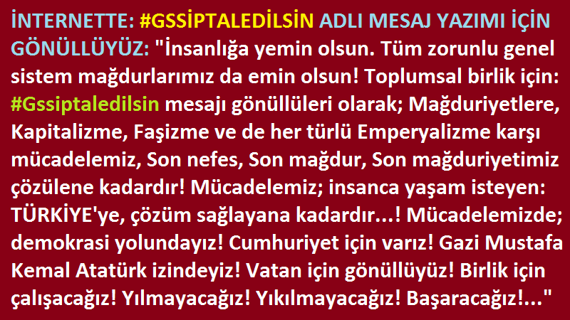 DAVET: #Tamam İçin Her Akşam 21.00 İtibariyle Kamuoyu Cumhuriyet, Vatan, Emek ve Ortak Konularda Birlik Sağlayana Kadar Paylaşım Yapıyoruz ÇAĞRI: Zorunlu Genel Sistem Sorunlarının Çözümü Amacıyla #GssİptalEdilsin Diyoruz: http://www.change.org/p/zorunlu-genel-sistem-sorunlarının-çözümü-amacıyla-gss-iptal-edilsin-diyoruz TALEP: Lütfen Buna Destek Verelim? SOSYAL GÜVENLİK SORUNLARINI ÇÖZELİM: İşsizden, çalışana ve emekli olana kadar birçok sorun yaşanıyor. Bunu toplumsal sorun kabul edelim. Siyaset dışında ortak görelim. Eşitsizlikler ve adaletsizlikleri çözelim. Sizin yada başkasının bir yakını bu sorunları yaşıyordur. Sgk. sisteminde eyt, sağlık, staj sigortası, işsizlik, emeklilik, çalışan mağduriyetleri gibi ortak sorunlar var. Duyarlı olalım. Örneğin gss. adlı sorun neredeyse ülke için ortak sorundur. Çoğu zaman af çıkıyor. Çoğu zaman af yokken ödeyen mağdur oluyor. Çalışan kişiler işsiz kalırsa yada emekli edilmeyen eyt. yasası mağdurları yine mağduriyeti yaşama riski var. Biliyorsunuz. 2012 yılının Ocak ayından itibaren işsizlere sigorta güvencesi yalanları adı altında Genel Sağlık Sigortası uygulaması başlatılmıştı. Bu durum çalışamayan iş bulamayan özellikle yeni mezun öğrencileri çok zor durumda bırakmaktadır. Böyle bir uygulama çıktığında çoğu medya kuruluşları bu konu üzerinde çok durmadı ve pek çok kimsenin haberi olmamıştı. Ancak yıllar sonra kendilerine gelen borçlardan dolayı bir çok kesimler uyandı. Ancak hala bilmeyenlerin olduğu görülmektedir. İşsiz insanlardan para talep eden, özellikle üniversite mezunu olup iş bulamayan çocukların ailelerini soyan GSS denilen bu uygulama son derece insanlık dışı bir uygulamadır. Devlet burada iş imkanları sağlayacağı yerde işsiz insanlara borç yazdırıyor. Benim sormak istediğim acaba bu uygulamaya karşı bir hukuki mücadele verilemez mi? Böyle bir mücadele yoluna başvurulsa eminim çok fazla destekçisi olacaktır. Bunun için neler yapılmalı? Hangi yollara başvurulmalıdır? Mecliste af dışında bu yasanın değişimi, yoksulluk sınırının arttırılması, 25 yaş üstünü mağdur etmemesi, isteğe bağlı olması, ücret ödeyenlere geri iadesi için girişim yapabilir misiniz? Bu konuyu duyurur musunuz? Var mısınız? Desteğiniz olur mu? Kamuoyu yaratır mısınız? Yardımcı olur musunuz? Paylaşımcı mısınız? Takipçi olur musunuz? Bilgisi olanlar #TAMAM etiketi ile internette herkes için paylaşabilirse çok seviniriz. DESTEK: Sponsor olarak yazıyı, resim, etiketi, imza kampanyasını paylaşım gerekiyor. Bu görseli daha çok kitlenin okuması gerekiyor. DAVET: #Tamam İçin Her Akşam 21.00 İtibariyle Kamuoyu Cumhuriyet, Vatan, Emek ve Ortak Konularda Birlik Sağlayana Kadar Paylaşım Yapıyoruz TALEP: Lütfen Buna Destek Verelim? ÇAĞRI: Zorunlu Genel Sistem Sorunlarının Çözümü Amacıyla #GssİptalEdilsin Diyoruz: http://www.change.org/p/zorunlu-genel-sistem-sorunlarının-çözümü-amacıyla-gss-iptal-edilsin-diyoruz