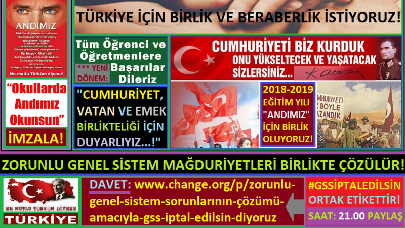 2018 - 2019 EĞİTİM VE ÖĞRETİM YILI BİRLİK MESAJIMIZ: www.change.org/p/zorunlu-genel-sistem-sorunlarının-çözümü-amacıyla-gss-iptal-edilsin-diyoruz BASIN AÇIKLAMASI: Saygıdeğer öğretmenler, Değerli veliler ve Sevgili öğrenciler! Geleceğimizin teminatı olan öğrencilerimizin okullarına, arkadaşlarına ve öğretmenlerine kavuştuğu yeni bir eğitim öğretim dönemine daha başlıyor olmanın sevinç ve heyecanını hep birlikte yaşıyoruz. Her zaman olduğu gibi Cumhuriyet, Vatan ve Emek değerlerinin kıymetini bilelim. Beyaz Ay yıldızlı al bayrağımızın önemini unutmayalım. Her zaman andımız ve istiklal marşımıza karşı vefa duyalım. Tarihimize ışık tutacak şeyleri göz ardı etmeyelim. Milli ve manevi değerlerimiz bizim için bütündür. Yerli malı, üretim, tarım, kalkınma ve eğitim gibi konuların ortaklaştığını bilelim. Cumhuriyet ilkelerine bağlıyız. Başöğretmenimiz Gazi Mustafa Kemal Atatürk izindeyiz. Emeğe saygılıyız. Vatan için duyarlıyız. Genç nesil olarak vatan ve emek ile cumhuriyet ilkelerini birlikte düşünelim. Atatürkçülük ve dayanışma düşüncesi sadece bir görüş değildir. Bir yaşam tarzıdır. Türkiye'nin tüm öğrencileri ve genç neslin aileleri; Evlatlarınıza Cumhuriyet zamanından başlayan süreçte edinilen Ulusal ve ülkece kıymetini bilmemiz gereken ortak değerlerimizi koruma ile yüceltmeye dayalı ve adaletli bir eğitim bilincini aşılayın. Evlatlarınıza ve çevrenize şu sözleri geleceklerine sahip çıkmaları için büyükleri olarak söyleyiniz. Size dayatılmak istenen tek tipleştirmeye karşı çıkın. Soran, sorgulayan, araştıran, düşüncesini açıklayan, konuşmaktan korkmayan bir kuşak olun. Kişiliğinize, yaşamınıza, hak ve özgürlüğünüze yönelik her türlü girişime tepki verin. Bu iletişim çağında sizden saklanmak istenen gerçekleri, doğru bilgiyi öğrenin, yaşamınıza uyumlu bir biçimde değerlendirin. Her olguyu sormadan benimseyen bir kul olmayın; özgür birer birey, onurlu birer yurttaş olun. Cumhuriyetin değerini bilin. Değerlerimizi koruyun ve onları emanet olarak görün. Onları koruyup yüceltecek olan yine sizlersiniz. Araştırıp sorgulama yeteneğine sahip, bilgi üretebilen ve bilimsel gelişmeleri takip edebilen nesiller yetiştirmek adına yeni bir heyecanla değerlendirilmesi gereken yeni eğitim öğretim dönemi, ülkemizi muasır medeniyetler seviyesinin üzerine çıkarma hedefi doğrultusunda en önemli basamağın nitelikli bir eğitim olduğundan hareketle, çocuklarımızın pozitif bilimleri kavramasının yanı sıra, milli ve manevi değerlerini öğrenme ve içselleştirmesi anlamında da iyi bir fırsat olarak görülmelidir. Başöğretmenimiz Gazi Mustafa Kemal Atatürk dediği gibi düşünelim. Öğretmenler yeni nesil sizin eseriniz olacaktır sözü sadece öğretmenler için değildir. Aslında toplumun geleceğine sahip çıkmasının yol ve yöntemini vurgulamıştır. Bu duygu ve düşüncelerle, başta sevgili öğrencilerimiz olmak üzere, saygıdeğer öğretmenlerimiz, değerli velilerimize hayırlar getirmesini ve tüm öğrenci kardeşlerimize başarılar getirmesini temenni ederiz. Yeni eğitim yılınız hayırlı olsun! <SAYFA YÖNETİMİ> - ÖZET: 2018 - 2019 EĞİTİM VE ÖĞRETİM YILI BİRLİK MESAJIMIZ: www.change.org/p/zorunlu-genel-sistem-sorunlarının-çözümü-amacıyla-gss-iptal-edilsin-diyoruz
