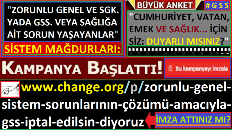 http://www.change.org/p/zorunlu-genel-sistem-sorunlarının-çözümü-amacıyla-gss-iptal-edilsin-diyoruz ZORUNLU GENEL SİSTEM SORUNLARININ ÇÖZÜMÜ AMACIYLA #GSS İPTAL EDİLSİN DİYORUZ: #10December #World #Human #Rights #HumanRights #HumanRightsDay #WorldHumanRightsDay MESAJ: #10Aralık #Dünya #İnsan #Hakları #Günü #DünyaİnsanHaklarıGünü #Kutlu #Olsun SON DAKİKA: #10AralıkDünyaİnsanHaklarıGünü ile beraber ortak sorunlara itiraz kampanyası çığ gibi büyüyor! KATILIM: Milyonlarca emekli ailesi, çalışan hanesine, işçilerin işten çıkanlarına, herhangi bir gelir sahibi olmayanlara, aylık 676 lira üzerinde hane halkı gelir tespit sonucu çıkanlara, 18 yaş yada 25 yaş üstü olarak çeşitli sistemsel sorunu olanlara, emeklilikte yaş engeline takılan sgk mağdurları, kpss ataması bekleyen yeni üniversite mezunlarına, mevsimlik işçilere, düzenli çalışmayan yurttaşlara ve diğer anlatım ile işsiz tanımı adı altında olan işsiz kişiler, işsiz kalan adı ile geçen ama Gss. sorunu ile adı geçmeyen birçok emekçilere ve aylık geliri bulanmayan birçok kişiye, GSS pirimini ödeyemediği ve gelir testine giremediğinden dolayı yüksek miktarlarda GSS pirim borcu taahhuk ettirildi. Daha önce hiç teste girmediyseniz zorunlu genel sağlık sigortası adı altında pirim borcunuz faizi ile birlikte 15.000 YADA 20.000 TL’yi buluyor. Son çıkarılan yapılandırma ve pirim afları mağduriyetleri gidermedi. Geçmiş pirim borçları silinecek diye söz verilmesine rağmen sadece 25 yaş altı gençleri kapsayacak şekilde daraltıldı. Hane halkı gelir testi yaptırmadıysanız 2012’den beri her ay için geçmişe dönük pirim ödemek zorundasınız. Çoğu kimseye bildirim dahi gelmiyor. Ne kadar borçlandırıldığından habersizler. Rastgele giriş yaptıklarında gördükleri rakamlarla şok oluyorlar. Kendilerine bir gelir isnat edilmiş aile geliri diye, oysa gelirin gerçek sahibi değiller. Gelir vergisi kanununa göre gelir kişiseldir ve gelirin gerçek sahibi onu kazanan ve elinde bulunduran kişidir. İstenilen maaş bordroları aileye değil kişilere aittir. Kanuna göre resen GSS’li yapılıp, gelir testine girmediği için sağlık yardımı alamayan, devlet hastanelerine ücretli muayene olan insanlar var. Oysa GSS’li yapılmış, kendisine borç taahhuk eden bir insanın neden sağlık hizmeti almaya müstahak olmaması anlaşılır gibi değil. Ülkemizde sistem tartışması altında “Daha Güçlü Türkiye” sloganıyla yola çıkılıp, kendilerine iş imkânı sağlamak yerine, gelirli olmayan insanlara başkalarının gelirlerinden gelir isnat edilip, yararlanmadığı bir hizmetin bedelini ödetmek hangi mantık, vicdanla bağdaşıyor? Aralarından üniversite mezunlarının olan insanlar var. İş bulamadıkları ve ödeme güçleri olmadığından gelir testine giremiyorlar. İmkânları olsa sigortalarını kendileri öderler, devlete muhtaç olmazlar. Hem işsizlik, hem de gelecek kaygısı içerisinde bocalarken hak etmedikleri bir borçla karşılaşmaktalardır. Uygulama mağduriyetlere neden olmaktadır; genel kabul görmemektedir; sürdürülebilir olmadığı bilinmektedir. Yine de yanlışta ısrar edilmekte ve hiçbir kapsamlı düzenleme yapılmamaktadır. Mülteciler sağlık yardımı alabilirken bu ülkenin pırıl pırıl evlatları, gerçek bir gelire sahip olmadıkları ve işsiz oldukları halde sağlık hizmeti alamayıp, kendilerine pirim borcu taahhuk ettiriliyor. Sağlık hizmeti almamış 25 yaş üstü gençlerin de pirim borçları silinsin. Mağduriyetler tabandan, tavana kadar kapsamlı ve somut olarak çözülsün istiyoruz. Bunu paylaşalım ! ZORUNLU GENEL SİSTEM SORUNLARININ ÇÖZÜMÜ AMACIYLA #GSS İPTAL EDİLSİN DİYORUZ: http://www.change.org/p/zorunlu-genel-sistem-sorunlarının-çözümü-amacıyla-gss-iptal-edilsin-diyoruz