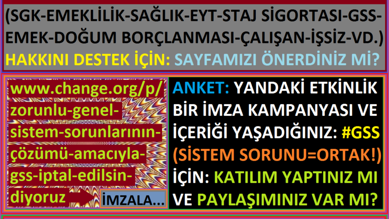 İMZA: www.change.org/p/zorunlu-genel-sistem-sorunlarının-çözümü-amacıyla-gss-iptal-edilsin-diyoruz - BİRLİK OLMAK VE DUYARLILIK ÜZERİNE BİR BİLGİ: "Günlerden birgün bir hikaye anlatılmış. Hikaye aslında toplumda ve ortak sorunları anlatırken; bencilliğin, duyarsızlığın, ayrışmanın olmaması gerektiğini ve herşey için ortak noktalar içinde kardeşlik, barış ve iyi niyet açısından olumlu davranmamız gerektiğini anlatan bir hikaye yaşanmış. Hikaye ama gerçek hayata bakınca aslında çok şeyin örneğini düşünebiliriz. Sorunları ortak, genel ve sistem içinde düşünelim. Bireysel ve duyarsız davranmayalım. Aynı sorunları anlatanlar için sözümüz duyarlı olalım ve ortak paylaşım yapalım. HİKAYE ÖRNEĞİ: Hikayede ne demiş? Bir ev var. Köy evi ve duvarı olarak başlıyor. Duvardaki çatlaktan bakan kuş, çiftlik sahibi ile karısının bir paket açtıklarını gördü. “İçinde yiyecek mi var?” derken, bir baktı ki kuş kapanı!!. Hemen bahçeye koşup, alarmı verdi: Evde kapan var! Evde kapan var!’ Tavuk gıdaklayıp, kafayı kaldırdı ve ‘Bay kuş, bu sizin için ciddi bir sorun olsa da, beni ilgilendiren bir tarafı yok ne yazık ki!’ Kuş dönüp bu sefer koyuna, “Evde kapan var, evde kapan var” dedi. Koyun konuyla ilgilendi ama, kendi hesabına ‘Üzgünüm bay kuş, vah vah emin ol senin için dua edeceğim” dedi. Kuş bu kez ineğe yöneldi: “Evde kapan var! Evde kapan var!” diye bağırdı nefes nefese. İnek: ‘Wow, Bay kuş, Senin için üzüldüm, ama burnumu sokacağım bir şey değil.’ dedi. E kuş da başını eğip, gitmekten başka çaresi kalmamıştı… Yalnızlık ve terkedilmişlik hisleri içinde, kuş kapanı ile artık tek başına başa çıkmaya çalışacaktı! O akşam evde, alışılmamış bir ses duyuldu. Sanki bir kapan, avının üzerine kapanmıştı. Sese koşan çiftçinin karısı, karanlıkta kapana, zehirli bir yılanın kuyruğunu kaptırdığını görmemiş. Yılan da kadını ısırmıştı.. Çiftçi karısını hemen hastaneye götürdü, Karısı eve ateşli ve hasta olarak döndü. Eee ateşli insana ne verilir? Sıcacık bir tavuk çorbası!!! Tavuk hemen kesilmiş ve acilen pişirilmiş! Ama kadın hala iyileşmiyormuş. Eee eş dost ahbap gelince hasta ziyaretine, çiftçi de sofraya koyunu çıkarmak zorunda kalmış!!!. Ama çiftçinin karısı iyileşmemiş; ölmüş!!!!!. Aman ne kalabalık gelmiş cenazeye, ne kalabalık!!! Bu sefer de konukları doyurmak için kesilen inek olmuş… Kuş da olan biteni deliğinin ardından izlemek kalmış!.- Onun için bir daha, seni ilgilendirmeyen bir sorun karşına çıkarsa bir düşün!!! - SONUÇ: Bir hikaye anlattık. Gerçek hayat değil. İçine baktığımız zaman zaten anlaşılıyor. Ama çıkaracağımız sonuç bizi ilgilendiriyor. Yaşamda bu örnek belki yok yada belki de var. Düşünmeye başlıdır. Araştırmaya, sorguya ve duyarlı olmaya göre değişen bir durumdur. Birimiz sıkıntı, sorun yada mağduriyet altındaysak, hepimiz risk altındayız. Bu hayat denen yolculukta birlikte yol almaktayız..Birbirimizi kollayıp, güç ve güveni paylaşmalıyız. Aynı şeyleri anlatıyor isek; yolumuz aynı olmalıdır. Yolumuz yada yöntemimiz bir noktada ortak olmalıdır. Yoksa yaşanan sorun bireysel olduğu için çözülmez. Mağdur olan yine herkes olur. UNUTMA: HEPİMİZ, BİRBİRİMİZİN HALI TEZGAHINDA HAYATİ ÖNEMİ OLAN İPLİKLERİZ!!! VE ŞÖYLE YA DA BÖYLE, HAYATLARIMIZ BİRLİKTE DOKUNUYOR… - NOT: Hikaye size anlamlı geldi ise lütfen imza kampanyamızı duyurun. Hepimiz vicdanlıyız. Duyarlı olmalıyız. İşsiz, çalışan, emekli yada emekli olamayan mağdur çevresi açısından ortak nokta aynı sistemdir. Konular farklı değil. Aslında aynı ağacın farklı meyvası gibi görünüyoruz. Birbirimiz için destek verelim. Bu ve benzeri yapıcı konuları lütfen paylaşın. Çevrenize anlatın. AMAÇ: Aynı bayrak altındayız. Vatanımız için emek verelim. Cumhuriyetimizi daha yüceltmeliyiz. Modern ve değişen zamana uyum sağlamalıyız. Üretim, toplumsal refah ve kalkınma ekonomisi için önemli konulara değinelim. Unutmayın. Sorunları çözüm yolu aynıdır. Aynı yöntemi düşünelim. Hepimiz toplumsal birlik, çözüm, duyarlılık ve kardeşlik içinde olmalıyız. İMZA: www.change.org/p/zorunlu-genel-sistem-sorunlarının-çözümü-amacıyla-gss-iptal-edilsin-diyoruz