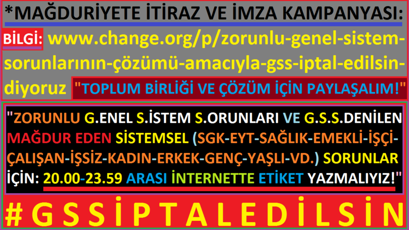 www.change.org/p/zorunlu-genel-sistem-sorunlarının-çözümü-amacıyla-gss-iptal-edilsin-diyoruz DAVET: #Gssiptaledilsin için birlik olalım ve imza kampanyasına katılım adresi: https://www.change.org/p/hayir-dediğimiz-toplumsal-sorunlarda-çözüm-bekliyoruz-ve-genel-mağduriyetleri-gideriniz UNUTMA: Bizi her mağdur etkiler. Tanımasak bile üzülürüz. Yitirilmiş ümitlere. Hiç gerçekleşmeyecek ideallere. Yaşanmamış sevgilere üzülürüz ! KATILIM: Geçmediğimiz köprüye, hasta sayısı tahmin edilerek özel şirketlere ihale edilen hastanelere, kullanmadığımız hava alanına, vatandaş olmayan mültecilere kendi işsizlerimize verilmeyen imkanlara ve gitmediğimiz hastaneye vatandaş olarak bütçeden ve cebimizden ayrı şekilde para ödemek haksızlık düşünüyoruz. Üreticilere yapılmayan ve toplum arasında eşitsizlik yaratan vergi indirimlerine de karşıyız. Milyonlarca işsiz gence, GSS pirimini ödeyemediği ve gelir testine giremediğinden dolayı yüksek miktarlarda GSS pirim borcu taahhuk ettirildi. Daha önce hiç teste girmediyseniz pirim borcunuz faizi ile birlikte 20.000 TL’yi ve hatta üzerini buluyor. Son çıkarılan yapılandırma ve pirim afları mağduriyetleri gidermedi. Geçmiş pirim borçları silinecek diye söz verilmesine rağmen sadece 25 yaş altı gençleri kapsayacak şekilde daraltıldı. Hane halkı gelir testi yaptırmadıysanız 2012’den beri her ay için geçmişe dönük pirim ödemek zorundasınız. Çoğu kimseye bildirim dahi gelmiyor. Ne kadar borçlandırıldığından habersizler. Rastgele giriş yaptıklarında gördükleri rakamlarla şok oluyorlar. Kendilerine bir gelir isnat edilmiş aile geliri diye, oysa gelirin gerçek sahibi değiller. Gelir vergisi kanununa göre gelir kişiseldir ve gelirin gerçek sahibi onu kazanan ve elinde bulunduran kişidir. İstenilen maaş bordroları aileye değil kişilere aittir. Kanuna göre resen GSS’li yapılıp, gelir testine girmediği için sağlık yardımı alamayan, devlet hastanelerine ücretli muayene olan insanlar var. Oysa GSS’li yapılmış, kendisine borç tahakkuk eden bir insanın neden sağlık hizmeti almaya müstahak olmaması anlaşılır gibi değil. Ülkemizde sistem tartışması altında “Daha Güçlü Türkiye” sloganıyla yola çıkılıp, kendilerine iş imkânı sağlamak yerine, gelirli olmayan insanlara başkalarının gelirlerinden gelir isnat edilip, yararlanmadığı bir hizmetin bedelini ödetmek hangi mantık, vicdanla bağdaşıyor? Aralarından üniversite mezunlarının olan insanlar var. İş bulamadıkları ve ödeme güçleri olmadığından gelir testine giremiyorlar. İmkânları olsa sigortalarını kendileri öderler, devlete muhtaç olmazlar. Hem işsizlik, hem de gelecek kaygısı içerisinde bocalarken hak etmedikleri bir borçla karşılaşmaktalar. Uygulama mağduriyetlere neden olmaktadır; genel kabul görmemektedir; sürdürülebilir olmadığı bilinmektedir. Yine de yanlışta ısrar edilmekte ve hiçbir kapsamlı düzenleme yapılmamaktadır. Mülteciler sağlık yardımı alabilirken bu ülkenin pırıl pırıl evlatları, gerçek bir gelire sahip olmadıkları ve işsiz oldukları halde sağlık hizmeti alamayıp, kendilerine pirim borcu tahakkuk ettiriliyor. Sağlık hizmeti almamış 25 yaş üstü gençlerin de pirim borçları silinsin. Mağduriyetler tabandan, tavana kadar kapsamlı ve somut olarak çözülsün istiyoruz. Bunu paylaşalım ! İMZA ATALIM: www.change.org/p/zorunlu-genel-sistem-sorunlarının-çözümü-amacıyla-gss-iptal-edilsin-diyoruz