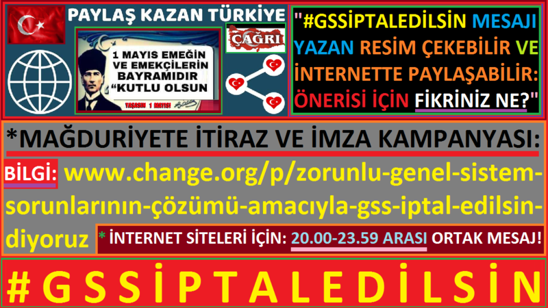 ZORUNLU GENEL SİSTEM SORUNLARININ ÇÖZÜMÜ AMACIYLA #GSSİPTALEDİLSİN DİYORUZ: www.change.org/p/zorunlu-genel-sistem-sorunlarının-çözümü-amacıyla-gss-iptal-edilsin-diyoruz STK: Ülkemizde emek mücadelesinde; Bizim özgür, adil ve eşit bir dünya umudumuz asla yenilmedi. Yenilmeyecek. Biz; insanca ve hakça bir düzeni bir gün mutlaka var edeceğiz! #1Mayıs ZORUNLU GENEL SİSTEM SORUNLARININ ÇÖZÜMÜ AMACIYLA #GSSİPTALEDİLSİN DİYORUZ: www.change.org/p/zorunlu-genel-sistem-sorunlarının-çözümü-amacıyla-gss-iptal-edilsin-diyoruz MESAJIMIZ: 1 Mayıs emeği, alın teriyle geçinen işçi ve emekçilerin işsizliğe, yoksulluğa, kayıt dışı ve güvencesiz çalıştırılmaya karşı onurlu ve insanca bir yaşam için haklarını ve mücadelelerini dile getirdikleri, birlik ve dayanışma gündür. Ülkemizde yıllardır insan merkezli olmayan yanlış ekonomi politikaları nedeniyle emek dünyası çok büyük hak kayıplarıyla karşı karşıya kalmıştır. 2003 yılında kayıtlı çalışanların yaklaşık yüzde 60’ı sendikalı iken bugün sendikalaşma oranı yüzde 12’lere kadar gerilemiştir. Ülkemizde emeğiyle geçinenler ve emek dünyası bugün de zor bir dönemden geçmektedir. İşsizlik ve yoksulluk her geçen gün artarken, emeğiyle geçinen milyonlarca vatandaş da geleceğe kaygı ile bakmaktadır. 1 Mayıs’ta yükselen sesin, ülkemizde tüm çalışanlara daha iyi çalışma koşullarının sağlandığı, taşeronluğun ortadan kaldırıldığı, herkesin insan onuruna yaraşır bir şekilde çalışarak ücret aldığı, iş kazalarının yaşanmadığı, refah toplumunun oluştuğu bir dönemin başlamasına vesile olması en büyük dileğimizdir. Bu duygu ve düşüncelerle ülkemizin dört bir yanında ekmek kavgası verirken iş kazalarında hayatlarını kaybeden emekçi kardeşlerimizi rahmetle anıyor, tüm çalışanların 1 Mayıs Uluslararası Birlik, Mücadele ve Dayanışma gününü kutluyor, aydınlık ve güzel yarınlar dileğiyle sevgi ve saygılarımızı sunuyoruz. ZORUNLU GENEL SİSTEM SORUNLARI DENİLEN ORTAK KONU İÇİN AÇIKLAMA: 2012 yılından 2015 yılına kadar aynı hizmete 3 tane ücret çıktı. Yani? Şimdi tek tip olanı konuşuyoruz. Herkes enayi yerine kondu. 435 liradan sonra artmadı ve 72 liraya düştü. Onu seçim zamanı 53 liraya düşürdüler. Akp döneminde oldu. Çok kişi sustu. Neden? Sisteme itiraz etmedi. Muhalefet sustu. Yoksulluğu önlemek kimin işi diye herkes birbirinin yüzüne baktı! Kaç tane yasa önergesi verildi? Halkın seçtiği sayın vekiller neredeydi? Yılda bir kez bile yasa değişim önergesi bu konu için veren sayılı kişi vardı. Sustu! Ama aylıkları herkes mecliste aldı mı? Bunun tersini duyan olmadı. İktidar ve muhalefet vekilleri her vekil gibi özlük ve sosyal haklarını aldı. Yalan değildir. Haklarını aldı! Sistemde hala değişim yoktu. Sonra primler 60,89 lira oldu. Şimdi 76,75 lira oldu! İktidarı ve muhalefeti eğer vatandaş olarak savundukça esas sorunları çözmeye zaman gelmez! Hukuk, insanlık ve kardeşlik bilinci lazım! Biz bunu sayfamızda yapmaya çalışıyoruz! Herkes, mağdurlar, diğer sayfalar ve kamuoyu da bir adım atsın! Yükümüz ağır! Yardımcı olunsun! Teşekkürler! ZORUNLU GSS, EMEK MAĞDURLARI VE SGK. İÇİN 1 MAYIS ETKİNLİĞİ. Sivil toplum gönüllüsü olan; işsizler, bağ-kurlular, ev hanımları, ezilenler, eyt. mağdurları, emek mağdurları, staj sigortası, emeklilik mağdurları, taşeron mağdurları, kiralık işçiler, sgk. mağdurları, gss. mağdurları ve işçiler: 1 Mayıs geliyor, bütün ülkelerin işçilerinin sınıf - bilinçli bir hayata uyanışlarını, insanın insan üzerindeki her türlü baskısına karşı mücadelelerindeki dayanışmalarını, emekçi milyonların yoksulluktan kurtulmak için yürüttükleri mücadelelerini kutladıkları gündür. Bu büyük mücadelede iki dünya karşı karşıya duruyor: Sermayenin dünyasına karşı emeğin dünyası; sömürünün ve köleliğin dünyasına karşı kardeşliğin ve özgürlüğün dünyası! Bunları düşünüyoruz. Sadece hak ve duyarlılık mücadelesidir. Samimi, dürüst ve kardeşçe düşünen herkese kapımız açıktır! Twitter için hepimiz hash tag: #gssiptaledilsin yazacağız. Birlik ve kardeşlik istiyoruz. Sorunları ortak ve adalet içinde çözebiliriz. Başaracağız. ZORUNLU GENEL SİSTEM SORUNLARININ ÇÖZÜMÜ AMACIYLA #GSSİPTALEDİLSİN DİYORUZ: www.change.org/p/zorunlu-genel-sistem-sorunlarının-çözümü-amacıyla-gss-iptal-edilsin-diyoruz
