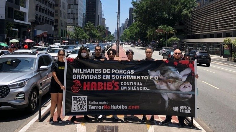 Fomos à Av. Paulista no último final de semana com faixas e panfletos, levando a centenas de pessoas informações sobre como é comum que porcas sejam mantidas em gaiolas onde mal podem se mover praticamente durante toda a gestação, e reforçando como já passou da hora do Habib’s se comprometer contra essa prática.