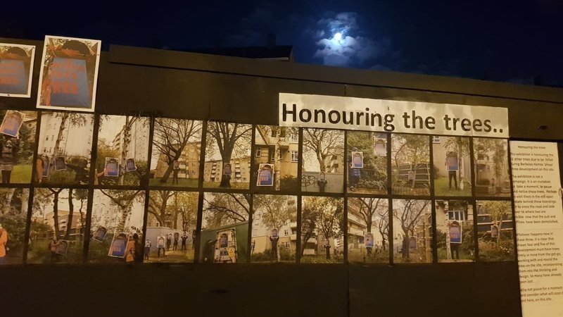 This exhibition on the hoardings behind the Happy Man Tree is honouring the 51 other trees due to be felled during Woodberry Down Phase 3 development.