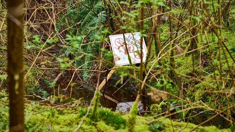 The photo I shot yesterday represents the cruel irony in one of the lies behind the logging in Stanley Park: A wildfire warning sign washed away in the park's wetlands.