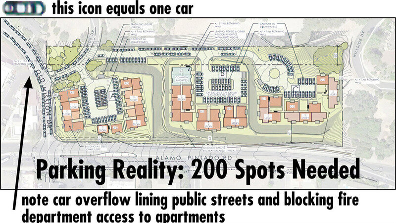 To make things worse, 200 filled parking spots will essentially block Fire Department and emergency vehicle access to the complex and possibly to the existing Mission Oaks development as well.