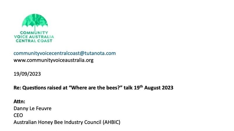 AHBIC CEO and Varroa Mite Coordinator attended our event “Where are the bees?” through Zoom on 19th August 2023, in the Central Coast. We unfortunately had a technical glitch which meant that we were unable to direct audience questions to them. The CEO reached out subsequently to say they are happy to address the questions raised.