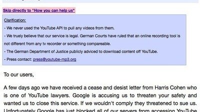 Youtube-MP3.org is a free, safe website that is used to download MP3 versions of videos hosted on Youtube. Google wants to shut it down because they claim that it violates their terms of service. Sites like Youtube-MP3.org are very popular across the internet, and Philip Matesanz, the owner of the site, estimates that about 200,000,000 people use sites like his one. It is safe and inoffensive, but Google wants to shut it down, even though in Germany, Philip's home country and the country Youtube-MP3 is hosted from, the service is legal and recommended.