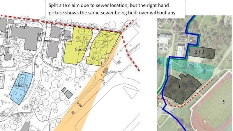 The School claim that the Thames Water sewer would result in a split building for a brownfield development as drawn by them above left. But wait a minute, they previously proposed to build across the sewer in that location when considering the brownfield option for the Science building. (page 17 of the original Design & Access statement) and shown as site 2/3.