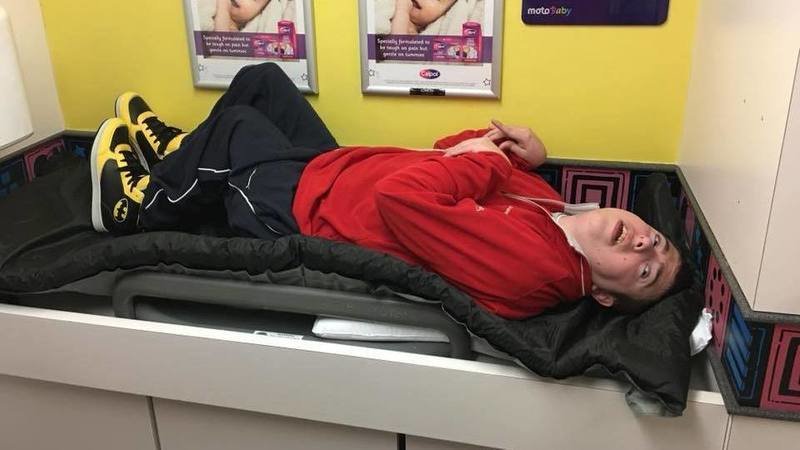 "Sorry everyone this is a bit of a rant. But I hope this can be shared far and wide!! Something needs to be done to change things. But my fear is that not enough will happen until it’s too late for many. Well Zack’s campaign for changing places at all motorway service stations, may have gone a little quiet as we await a response from Moto, Welcome Break and Roadchef.... But the issue itself is as important as ever. Not only at motorway service stations, but everywhere. Travelling down to Cheltenham today and, as we would on any journey when we know there are not adequate facilities for Zack, we prepare for the worst and hope for the best. But we encountered one of the most unpleasant and distressing experiences on route. My 22 year old adult, son was apologising to me for needing an urgent pad change. He was very upset about this. He has nothing at all to be sorry about! We stopped at the nearest service station knowing full well we will have to change him on the floor. (But what was the alternative?). Without going into too much detail, his skin was burning. Anyway we reached the Moto service station at Knutsford, and there was not enough space to get his wheelchair into the ‘accessible’ ‘disabled’ toilet. But there was a baby changing bench in another room. What a compromise, hey? At Zack’s insistence, I did something I’ve never done. It broke my heart to do it. But I totally understand why he wants me to. I took pictures of him lying on the changer. It was very narrow and so high that Ceri had to stand on a chair to do what we needed to do. It was uncomfortable and painful for Zack and extremely difficult to ‘clean him up’. This, of course, is not the first time nor will it be the last. Actually it makes a change to not be on a dirty floor. Ironically the reason for our trip was for a meeting about Mobiloo, a fantastic facility which provides all the facilities Zack and people like him need. And while this isn’t a permanent solution for the lack of facilities in these places, I’m increasingly finding it to be the only solution. I see so many fabulous mums campaigning for these facilities for their children but all these children grow into adults, and believe me it gets harder, not just physically, but emotionally. If people don’t have dignity then what’s the point? I feel so angry!! Let’s hope we get back home without needing to stop again."