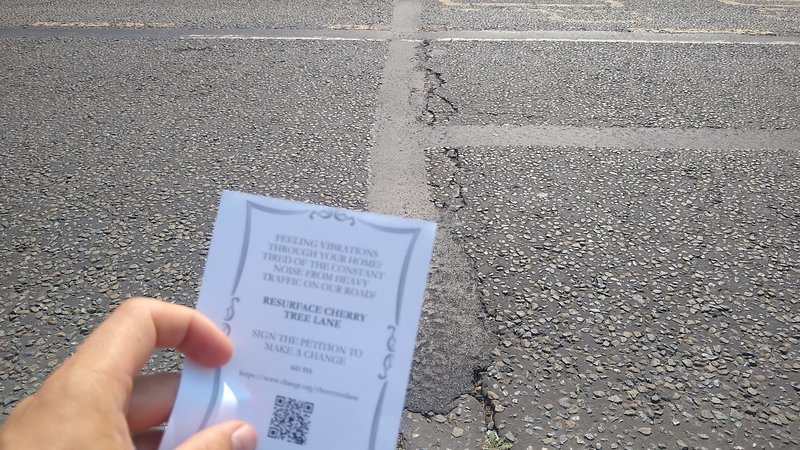 Following the meeting on the 30th July, Councillor Graham Williamson has offered to hand in the petition with the next Full Council meeting on the 9th September. It is important that the Councillor can hand in as many signatures as possible for the Council to prioritise Cherry Tree Lane to be resurfaced.