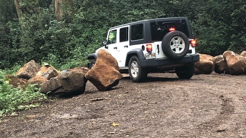 It is unknown why the DLNR chose to trench the road and block it off before removing the Jeep that recently ended up in the water of Uhau’iole Stream.The heavy equipment was on site digging the trench to block the road just hundreds of yards from Jeep in water.