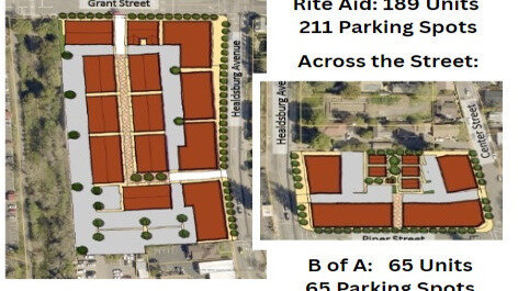 Above is an excerpt from the report purchased by the taxpayers of Healdsburg so the City Council could better envision what the future of Healdsburg could hold if only they could relieve the voters of the burden of democratically determined growth. It's 254 units on two lots across the street from each other. The document proposes 762 people with 276 parking spots with an average of three people per household.