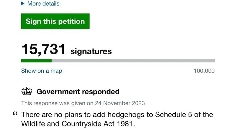 The government's response to the hedgehog petition, while acknowledging the decline of the species and expressing concern, falls short in addressing the urgency and severity of the situation. While the government highlights existing legislation and initiatives aimed at habitat restoration, it fails to provide a compelling argument against the proposed addition of hedgehogs to Schedule 5 of the Wildlife and Countryside Act 1981.