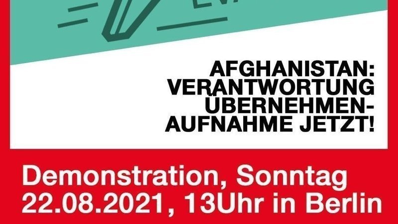 - Kommt mit uns gemeinsam zur Demo in Berlin am kommenden Sonntag und mobilisiert für diese. Sie wird am 22.8. Um 13 Uhr im Regierungsviertel stattfinden. Der genaue Ort wird noch über folgenden Link bekannt gegeben: https://seebruecke.org/aktionen/afghanistan-verantwortung-uebernehmen-aufnahme-jetzt