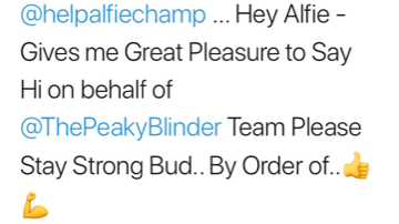 Shelley Wells has started a wish for Alfie, knowing how much he loves Peaky Blinders she took to Twitter and tried her best to get the cast to say hi. Packy Lee from the programme sent Alfie this message this morning on Twitter which really made my boy happy!