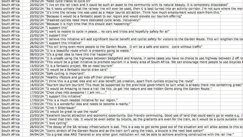 After more than decade had passed since trying to secure the rail corridor between Knysna and George for non-motorised mobility I was alarmed to hear that Transnet had received a proposal for the repair of the railway to bring the steam train back into service. In the most obvious places to seek support for the NMT alternative there was an inexplicable resistance to proposing NMT. This was in sharp contrast to the average person seeking beautiful places to walk, jog or cycle so I began working on a petition to record their support.