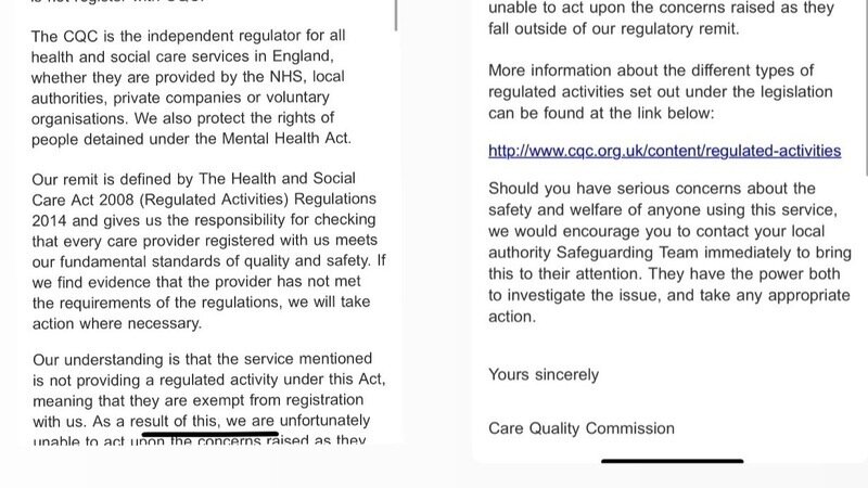 They told me that Southern Housing isn’t providing a “regulated activity” under their remit, so they can’t investigate or intervene. That means despite being registered with the CQC, Southern Housing is essentially untouchable because they’re not delivering personal care or treatment that would legally fall under the regulations.