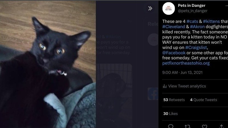 "Dyou [sic] really think this person is... giving kittens to dogfighters... publicly... to get back at you?" someone asked in Akron's sub. The black cat pictured in this petition update was posted shortly after I took a letter to McCoy's judge and warned the woman who posted the black cat on Craigslist about McCoy and the woman who breeds kittens and collects cats for him. In that photo, they tied the cat's hind legs together so she couldn't protect herself from McCoy's pitbulls. This face is the level of evil we're dealing with in this country and around the world. Please continue to share this petition. Thousands of people are rehoming pets due to inflation and other excuses. Reading this may save a life.